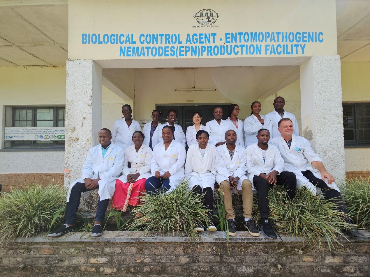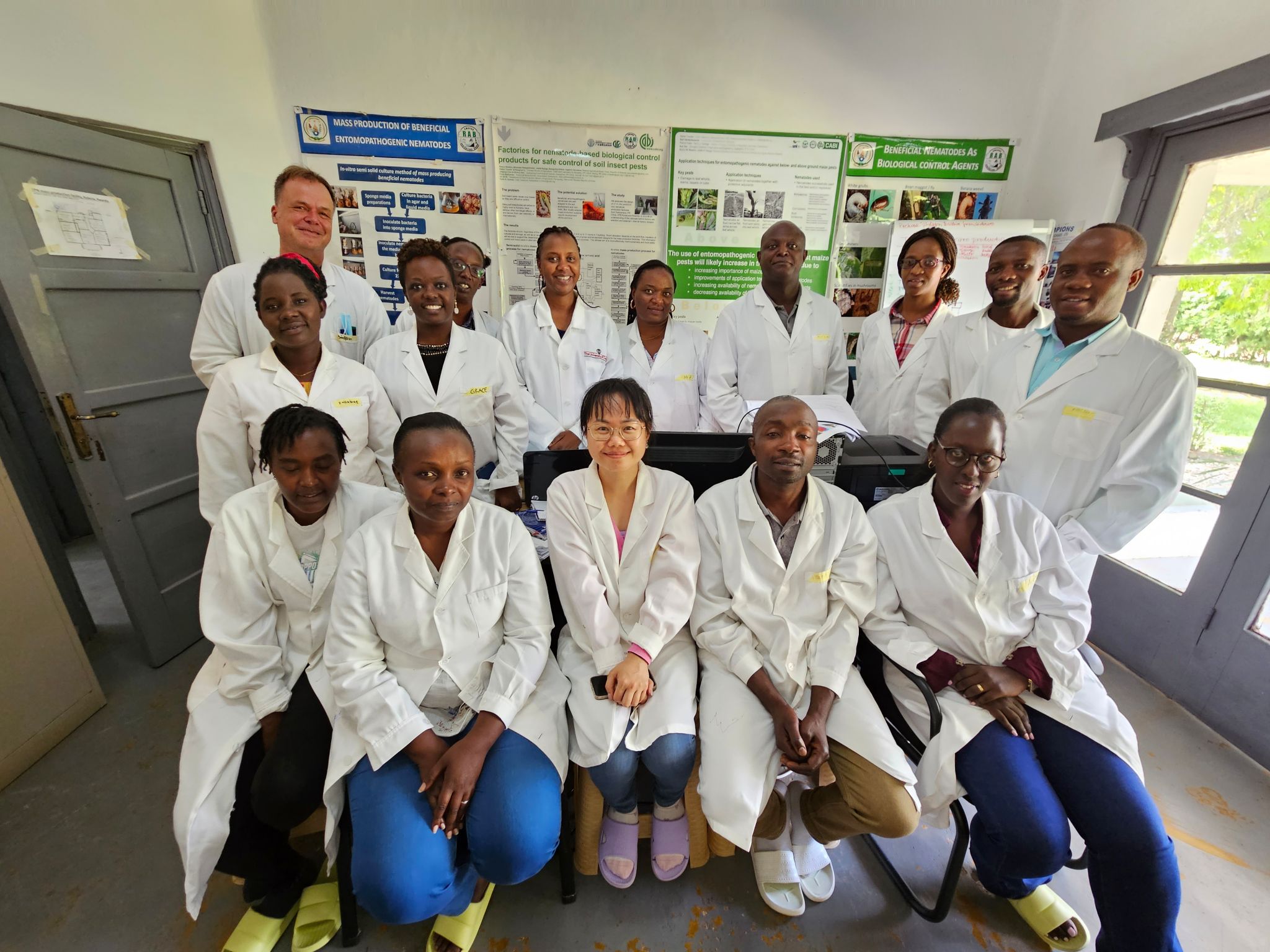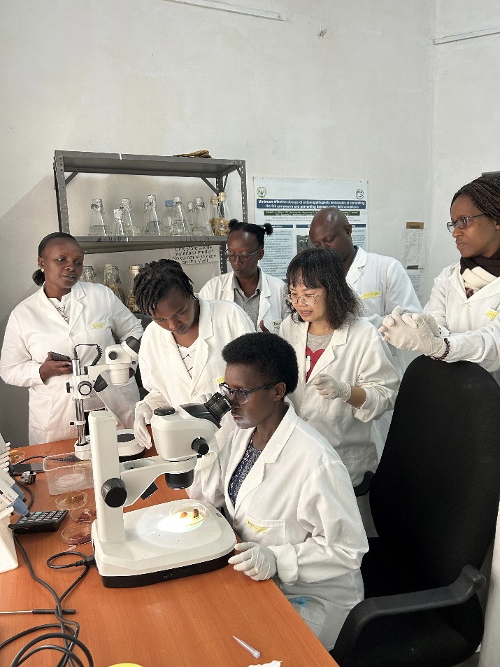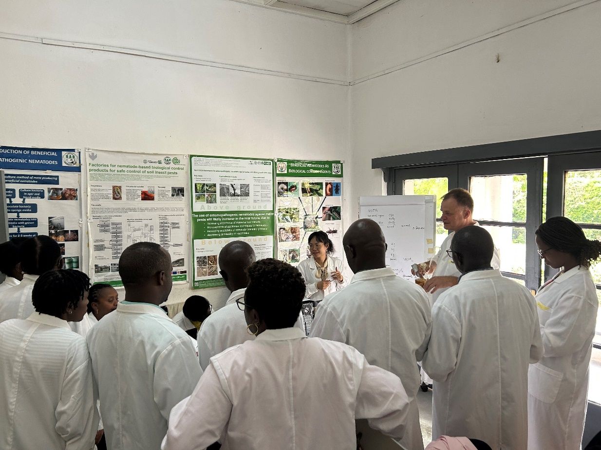 颜珣与CABI瑞士中心的Stefan Toepfer博士一起,在RAB南方区生物制剂生产基地对来自RAB、卢旺达大学(University of Rwanda-CAVM)、生物防治公司AgroyPy和科技公司IPRC-Huye的科学家、技术人员和研究生提供昆虫病原线虫大量培养及应用技术的培训,同时指导开展昆虫病原线虫及共生细菌培养基优化、昆虫病原线虫防控食用菌害虫生物测定等实验,并对前期实验收集的数据进行分析,撰写应用昆虫病原线虫防控草地贪夜蛾和番茄潜叶蝇的研究论文,为项目结题做准备。颜珣出访卢旺达期间,恰逢中国工程院院士、广东省科公司微生物研究所吴清平院士带领团队在卢旺达采集样品,颜珣邀请吴院士团队参观了我们参与建设的RAB南方区生物制剂生产基地,吴院士鼓励RAB团队继续开展应用昆虫病原线虫防治食用菌害虫的研究并进行应用推广。