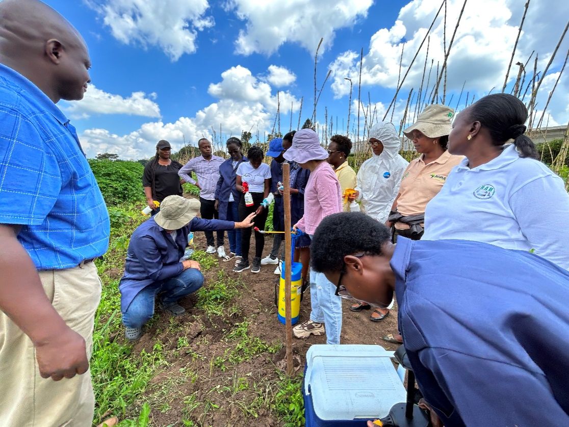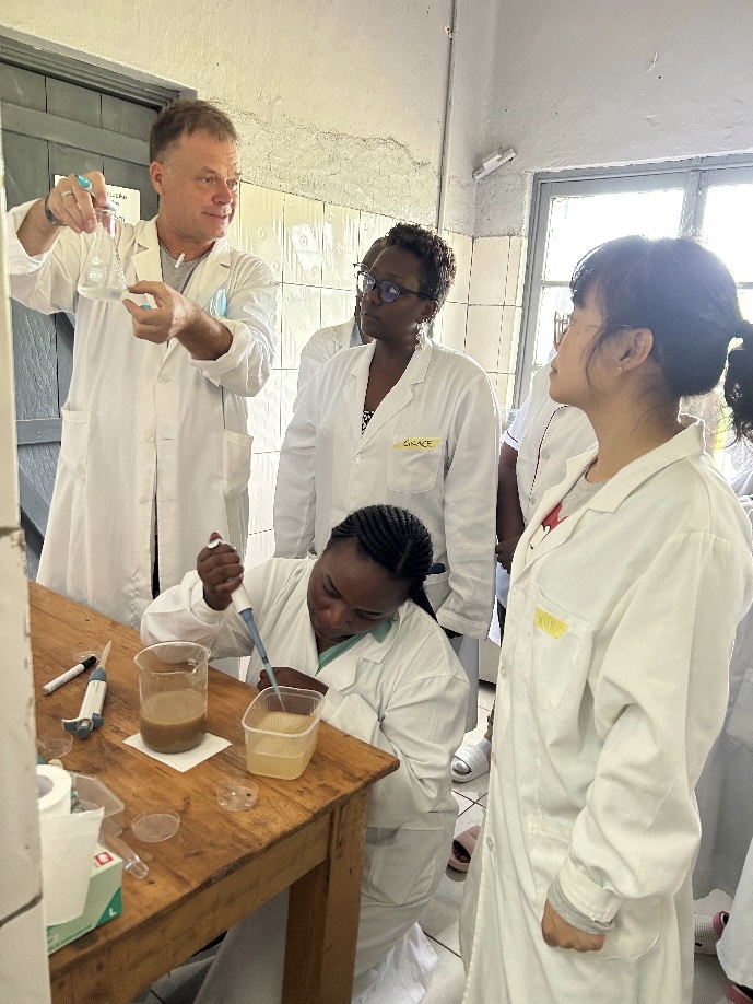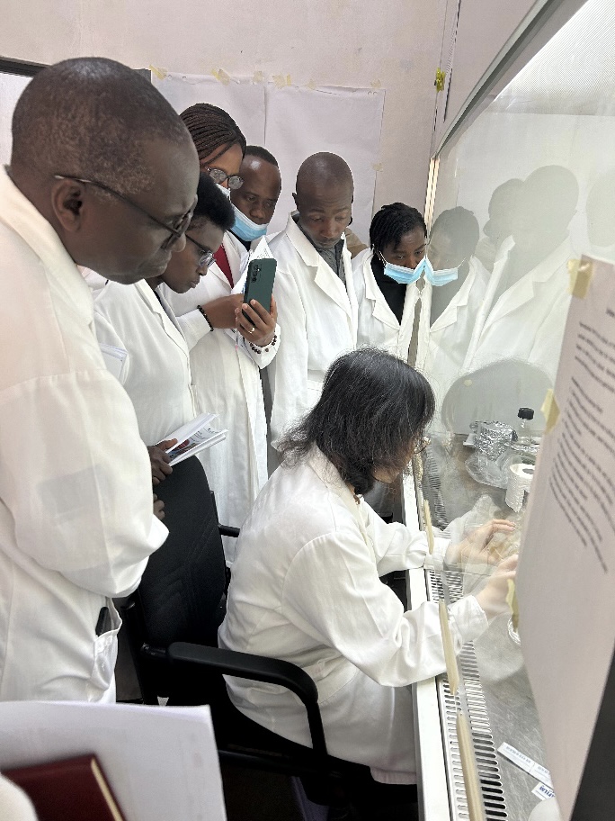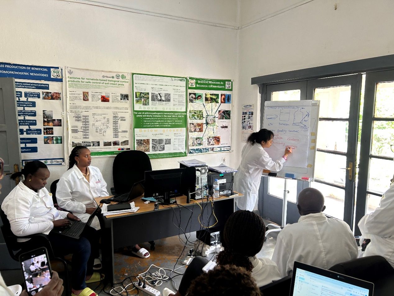 颜珣与CABI瑞士中心的Stefan Toepfer博士一起,在RAB南方区生物制剂生产基地对来自RAB、卢旺达大学(University of Rwanda-CAVM)、生物防治公司AgroyPy和科技公司IPRC-Huye的科学家、技术人员和研究生提供昆虫病原线虫大量培养及应用技术的培训,同时指导开展昆虫病原线虫及共生细菌培养基优化、昆虫病原线虫防控食用菌害虫生物测定等实验,并对前期实验收集的数据进行分析,撰写应用昆虫病原线虫防控草地贪夜蛾和番茄潜叶蝇的研究论文,为项目结题做准备。颜珣出访卢旺达期间,恰逢中国工程院院士、广东省科公司微生物研究所吴清平院士带领团队在卢旺达采集样品,颜珣邀请吴院士团队参观了我们参与建设的RAB南方区生物制剂生产基地,吴院士鼓励RAB团队继续开展应用昆虫病原线虫防治食用菌害虫的研究并进行应用推广。
