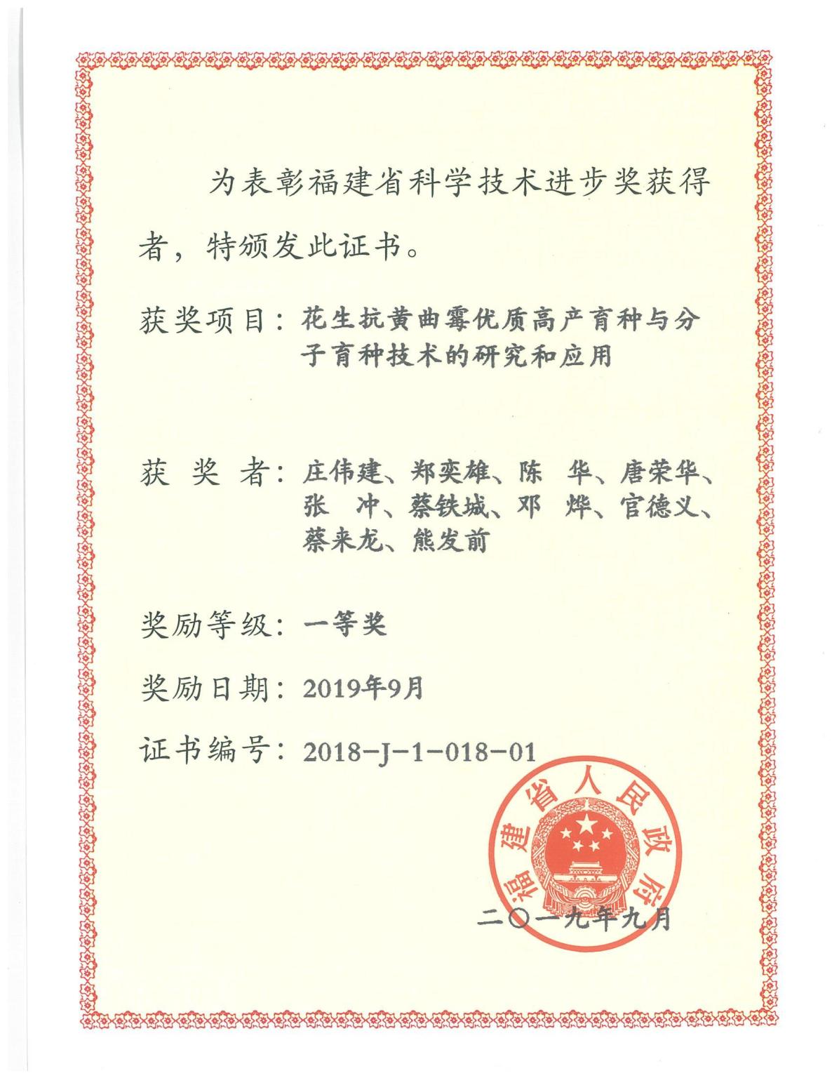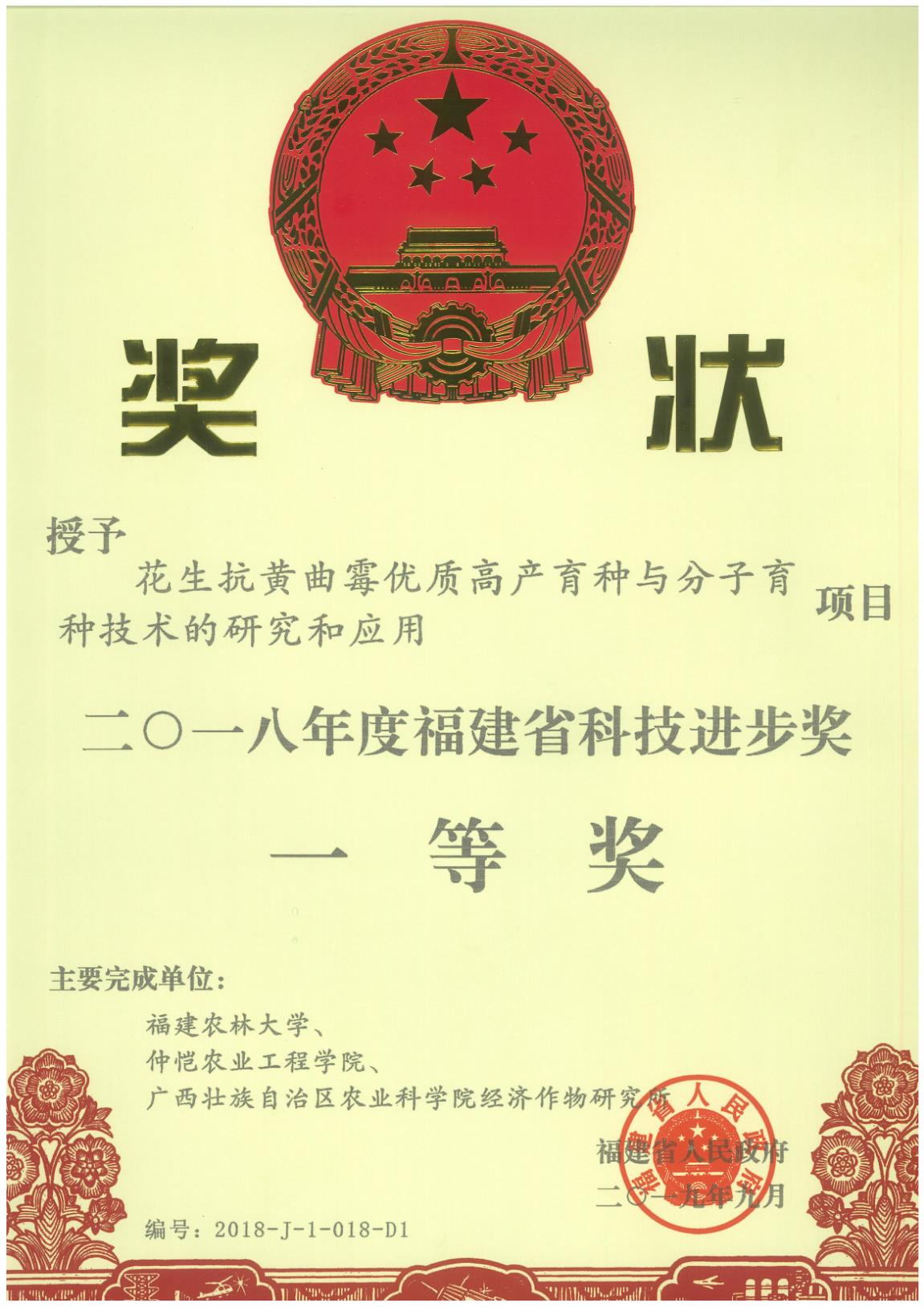近日,公司参与完成的“花生抗黄曲霉优质高产育种与分子育种技术的研究与应用”,荣获二〇一八年度福建省科技进步奖一等奖。这是从日前福建省人民政府公布的2018年度省科学技术奖励名单上获悉的,该成果由福建农林大学、伟德bv1946官网、广西壮族自治区农业科公司经济作物研究所共同完成,公司为第二完成单位、郑奕雄教授为第二完成人。