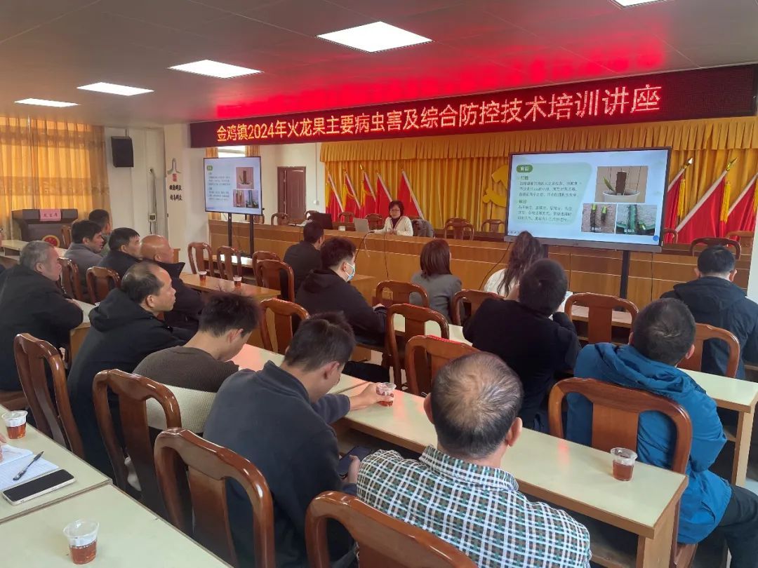 上午,科技特派员团队抵达罗定市金鸡镇后,与金鸡镇驻镇帮镇扶村工作队队长叶丽平等同志在金鸡镇人民政府会面,就金鸡镇火龙果产业最新发展状况进行交流。针对金鸡镇火龙果产业发展现状,科技特派员在金鸡镇人民政府多媒体培训室为乡镇干部及种植户开展相关技术培训。颜珣研究员开展火龙果主要病虫害及综合防控技术培训讲座,对火龙果品种、种植技术、常见病虫害种类、病虫害综合防控方法及注意事项等进行了系统详细的讲解,并将综合防控及绿色农业的理念传播给在场的培训人员。团队邀请了新兴县绿丰优果农业科技有限公司孔林发开展火龙果高产种植技术培训讲座,从火龙果丰产栽培管理要点入手,带领村民学习相关管理方法与技术操作,图文并茂,通俗易懂,为火龙果种植户农业生产实践提供了扎实的理论支持与技术保障。