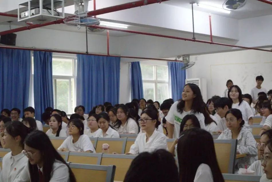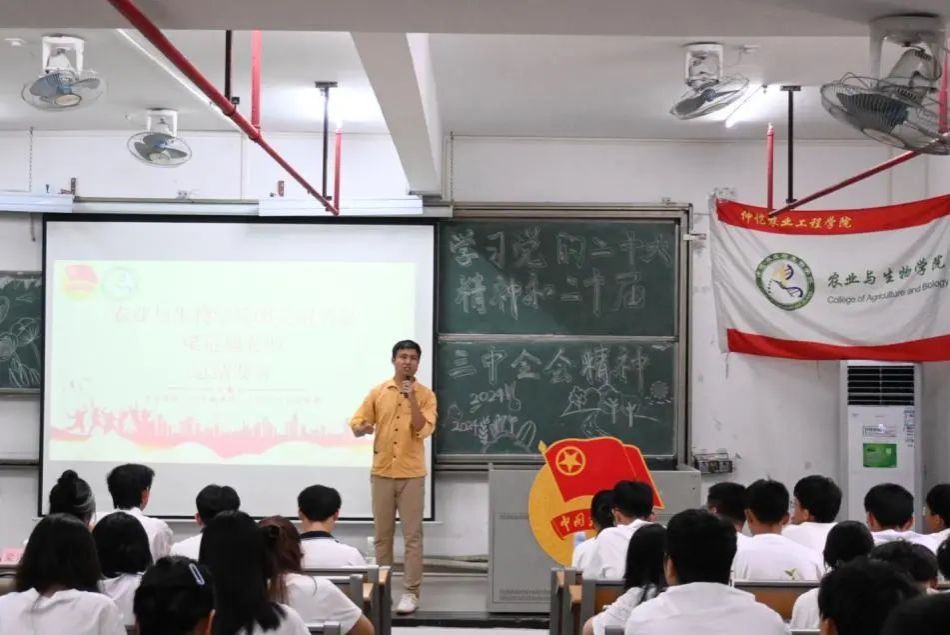 团课伊始,全体师生起立奏唱共青团团歌,同学们歌声激昂嘹亮,洋溢着青春的热情与对党的坚定忠诚。课上,梁定超围绕不同历史时期的大学文化生活背景,向同学们阐述了共青团的光辉历史与历次共青团全国代表大会的演进脉络,生动讲解了党的二十大精神和党的二十届三中全会精神,言辞恳切,句句深入人心。