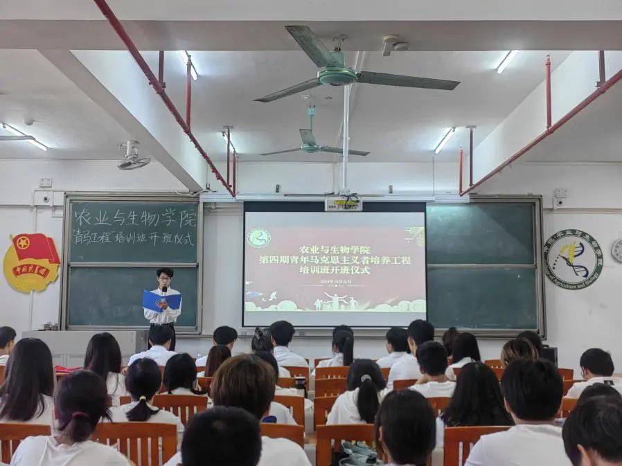 开班仪式开始,“青马工程”培训班学员代表黄金辉向大家宣读培训班的班级须知,规范班级的纪律要求。接着,周超雄为“青马工程”培训班学员代表陈铭昕授旗并做致辞,他对培训班的开班表示祝贺,并在举办培训班的目的和意义、对培训班成员期望等方面进行了阐述。周超雄指出:一是把参加集中培训和长期自学结合,政治上的坚定来源于理论上的清醒;二是把树立远大志向与选择正确成长路径结合起来。三是把理论学习与实践锻炼相结合,发挥桥梁纽带作用,建设优良学风、班风、院风。小我融入大我,心系家国情怀,真正为中国式现代化贡献青春力量。周超雄希望通过系统的理论学习和实践锻炼培养一批政治可靠、信仰坚定并且能力突出的青年,这批青年理想信念,加强理论素养,不断深化党的理论认识,不断从中汲取科学智慧和理论力量。