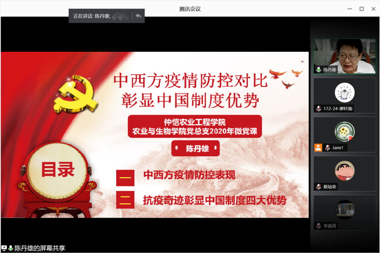 为庆祝中国共产党成立99周年,重温党的光辉历程,增强支部凝聚力和战斗力,7月1日晚上,伟德bv1946官网员工党支部通过腾讯会议平台举行了“初心不改,奋斗不止”主题党日活动,出席本次活动的有农业与生物公司党总支书记陈丹雄,员工第一支部书记高结怡,农生院全体员工党员参加了本次活动。活动由公司专职组织员周静静主持。