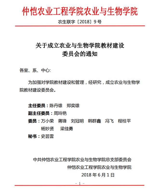 农生联字〔2018〕9号-关于成立伟德bv1946官网教材建设委员会的通知