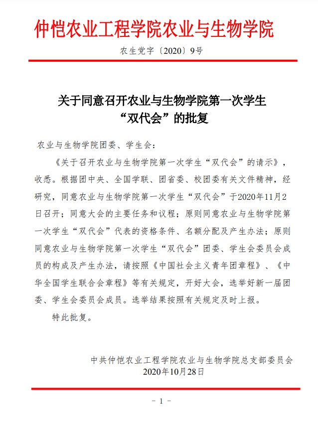 农生党字〔2020〕9号-关于同意召开伟德bv1946官网第一次员工“双代会”的批复