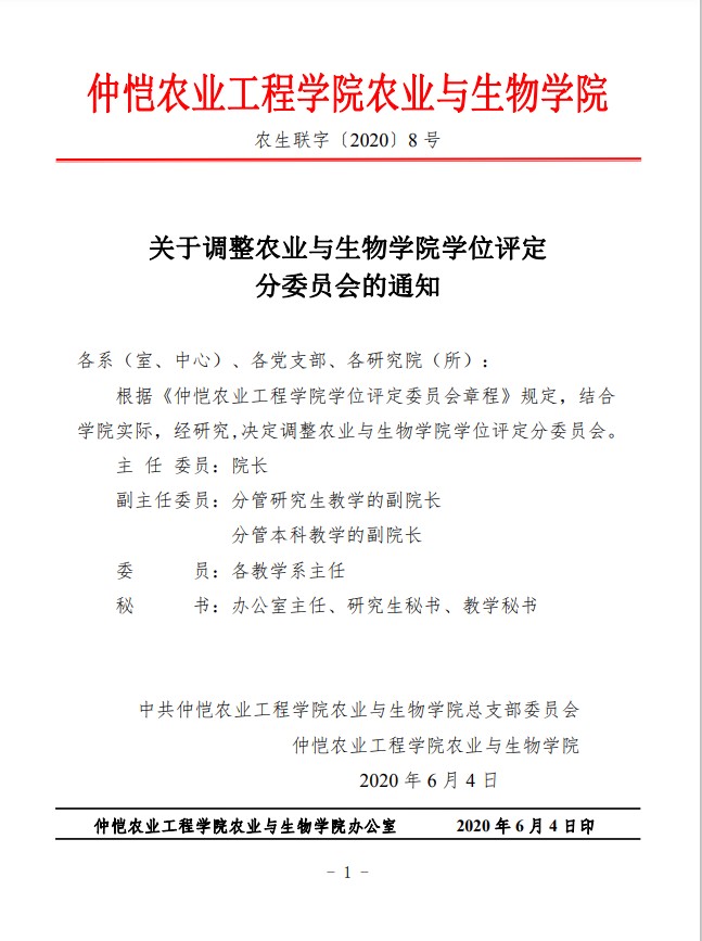 农生联字〔2020〕8号-关于调整伟德bv1946官网学位评定分委员会的通知