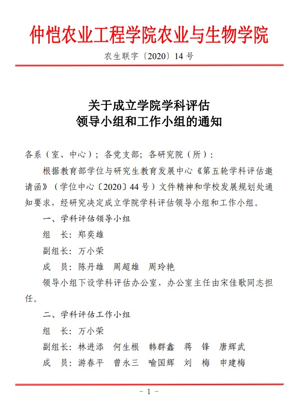 农生联字〔2020〕14号-关于成立学科评估领导小组和工作小组的通知