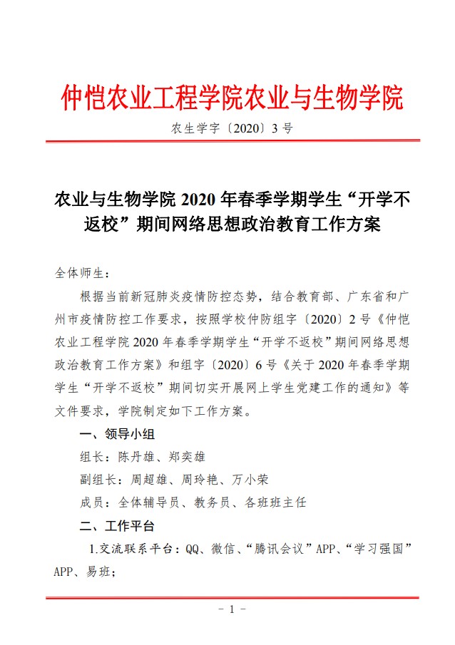 农生学字〔2020〕3号-伟德bv1946官网2020年春季学期员工“开学不返校”期间网络思想政治教育工作方案