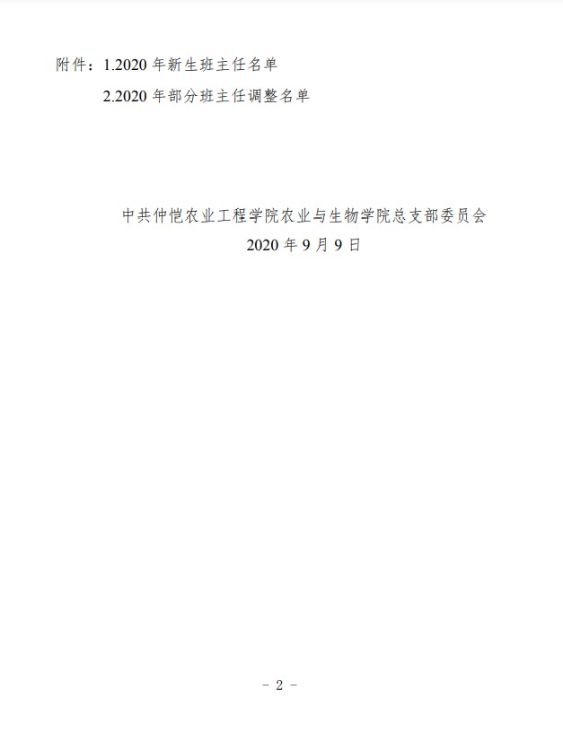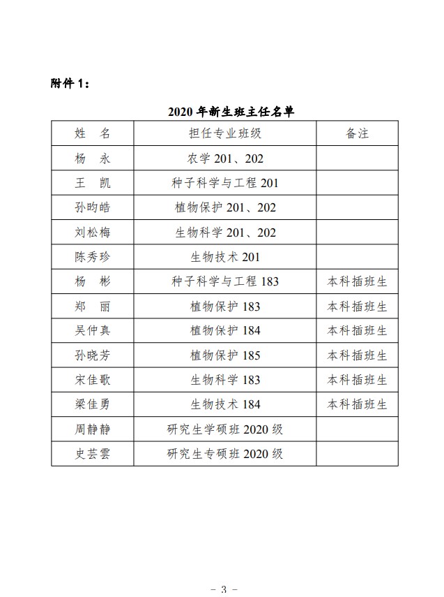 农生学字〔2020〕8号-关于聘任2020年新生班主任及部分班主任调整的决定