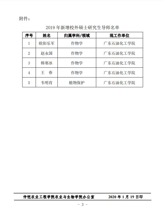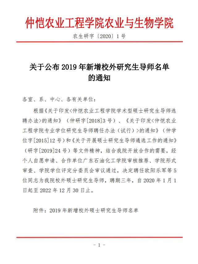 农生研字〔2020〕1 号-关于公布2019年新增校外研究生导师名单的通知(1)