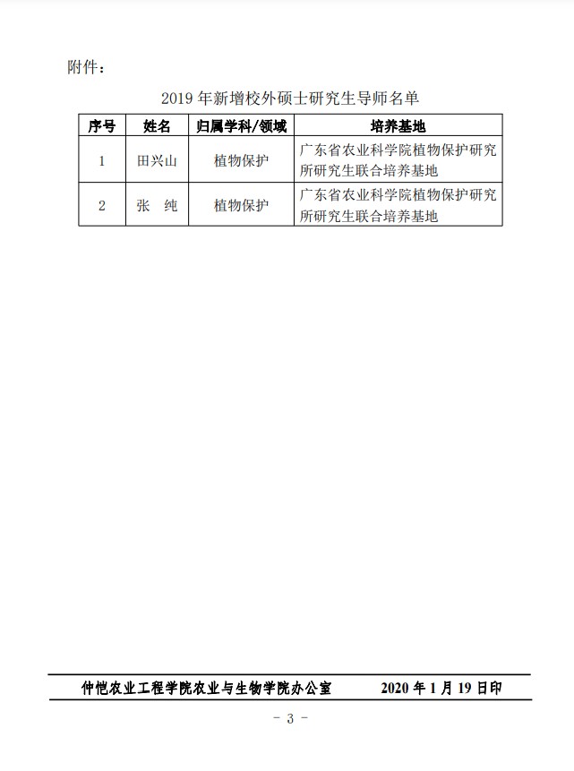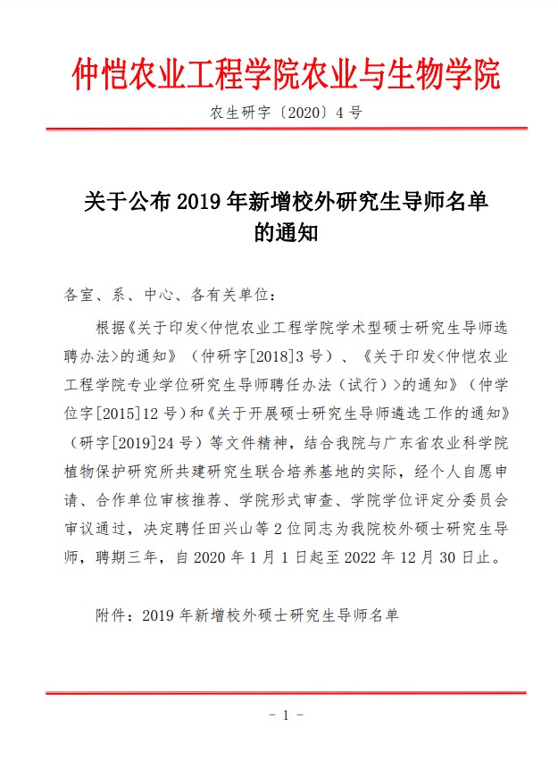 农生研字〔2020〕4 号-关于公布2019年新增校外研究生导师名单的通知(1)