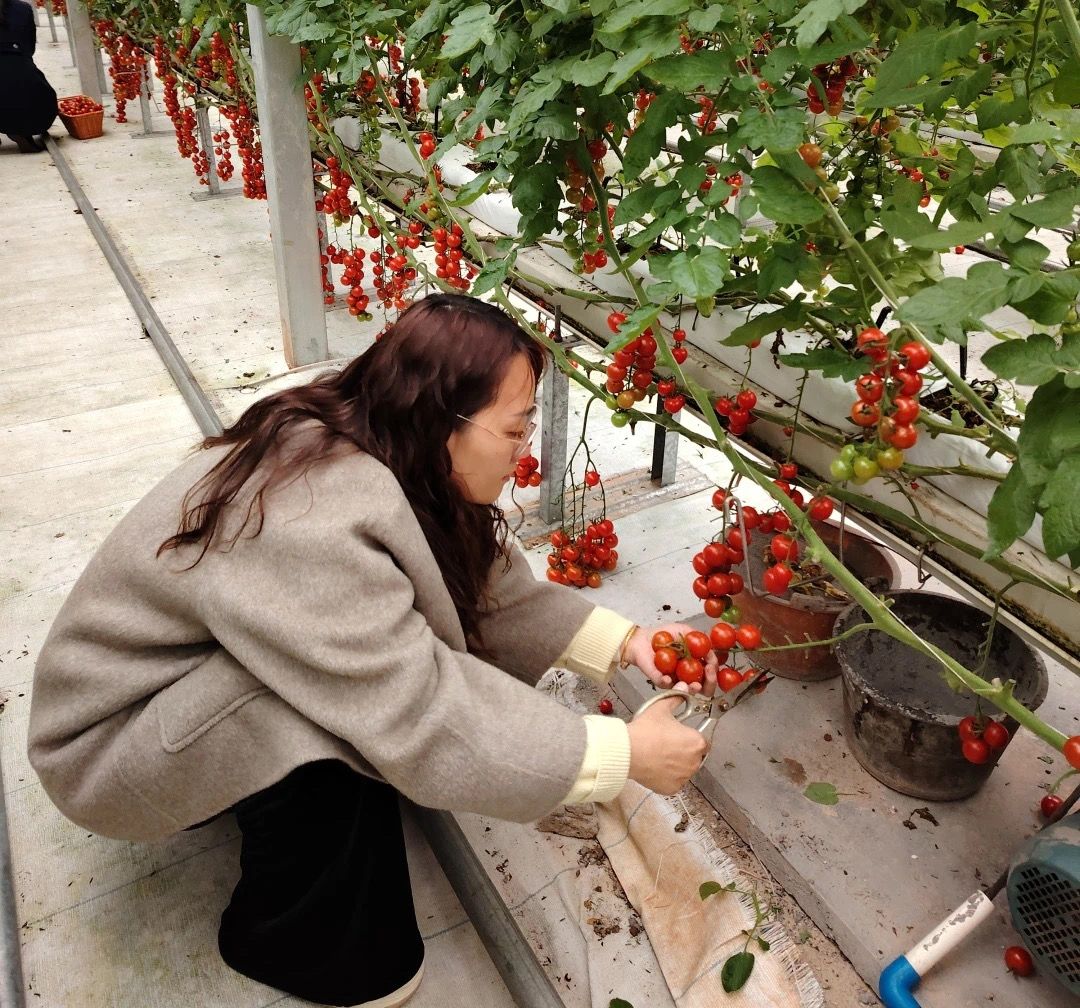 农场的栽培大棚内,瓜果飘香,春意盎然,老师们兴致勃勃地参观了农场种植的樱桃番茄和草莓等作物,纷纷拿起工具,亲自采摘和品尝美味的樱桃番茄,现场一片欢声笑语,呈现出欢乐祥和的节日气氛。