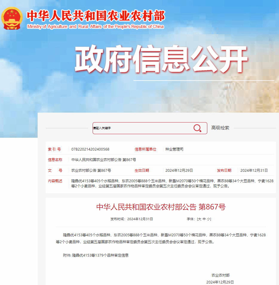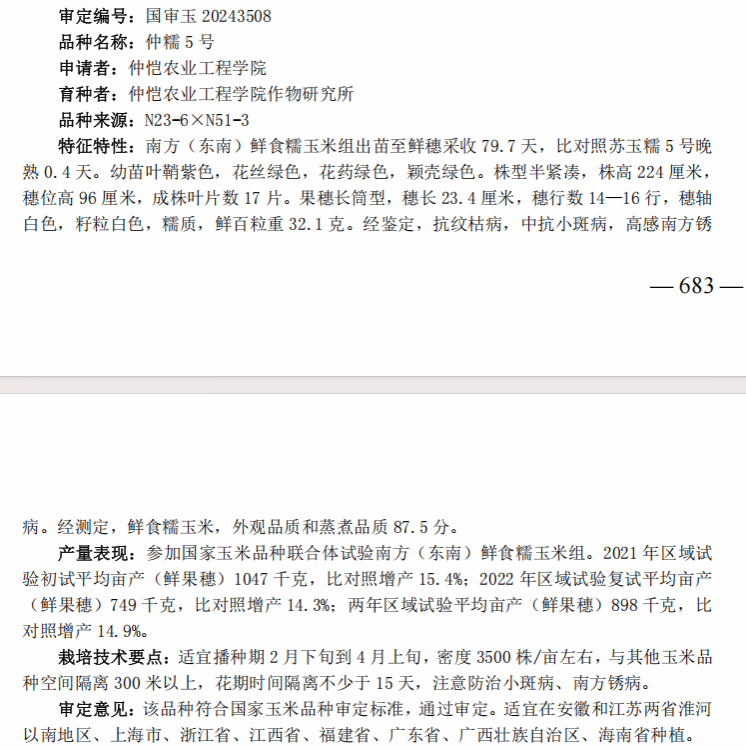2024年12月29日,中华人民共和国农业农村部发布公告第867号。公司自主选育申请的糯玉米“仲糯5号”符合国家玉米品种审定标准,经第五届国家农作物品种审定委员会第 五次主任委员会会议审定通过,经农业农村部公示期满,予以公告。