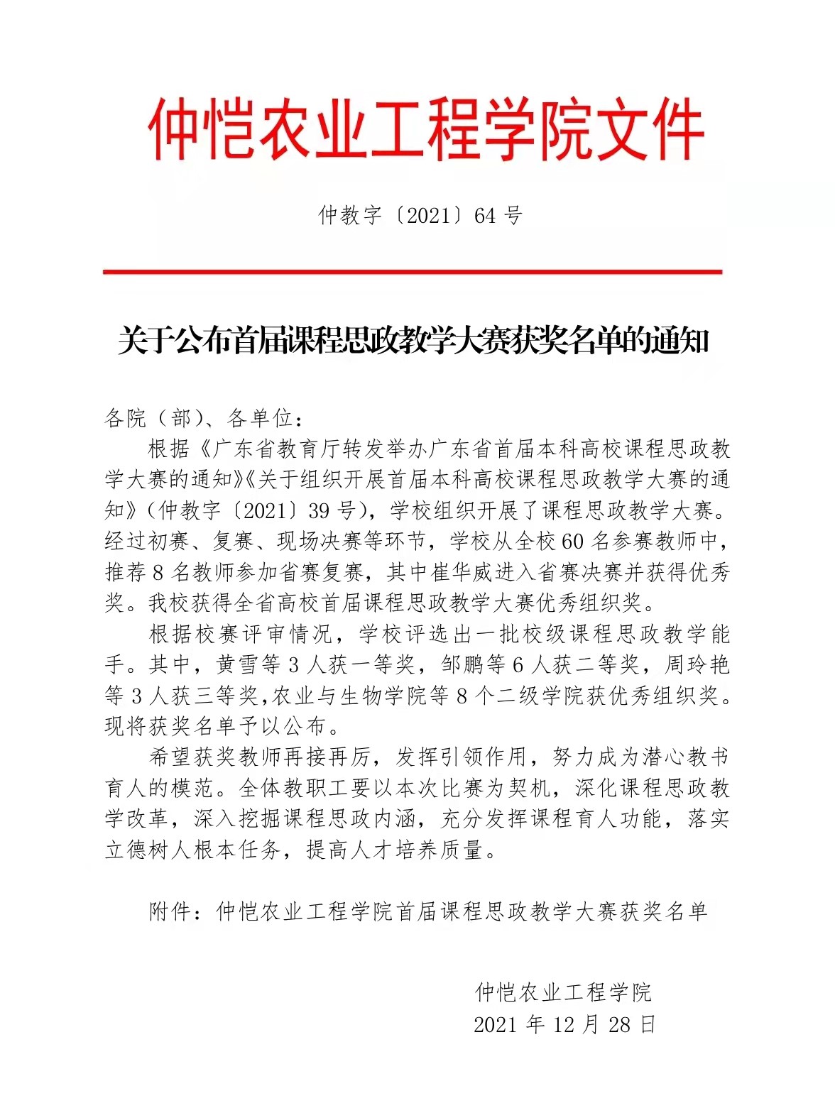 根据《广东省教育厅转发举办广东省首届本科高校课程思政教学大赛的通知》《关于组织开展首届本科高校课程思政教学大赛的通知》(仲教字〔2021〕39 号),公司组织开展了课程思政教学大赛。经过初赛、复赛、现场决赛等环节,公司荣获优秀组织奖,崔华威老师荣获二等奖、周玲艳老师荣获三等奖,其中崔华威老师经过层层选拔以及公司推荐成功进入省赛复赛并荣获优秀奖。