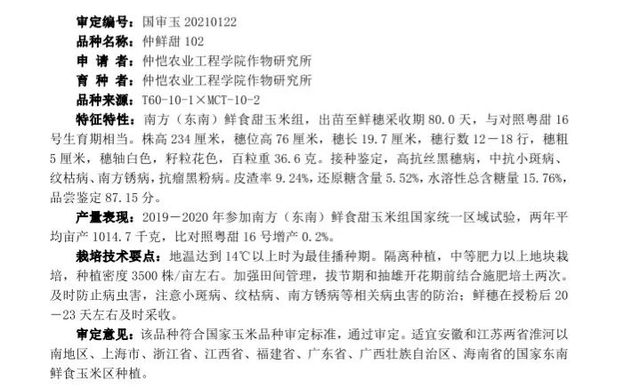 2021年12月31日,中华人民共和国农业农村部发布结果公告第500号。公司作物研究所申请的甜玉米“仲鲜甜102”符合国家玉米品种审定标准,经第四届国家农作物品种审定委员会第八次会议审定通过 ,证书编号:国审玉20210122 ,予以公告。这是一种莫大的荣誉与激励,新的一年,公司将继续发扬积极进取的开拓精神,加大研发力度,培育更多高产优质品种,为国家增产增收,作出更大贡献。