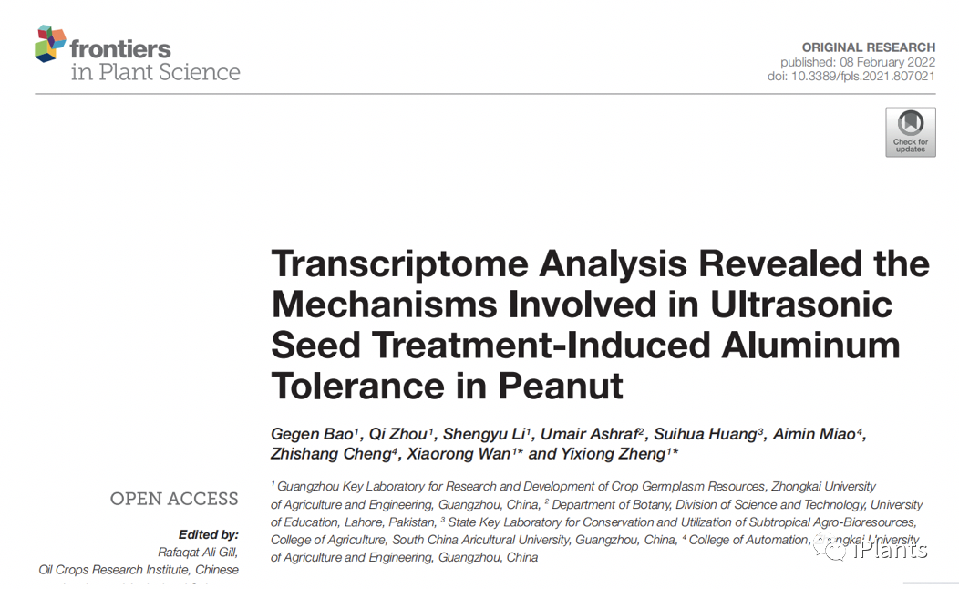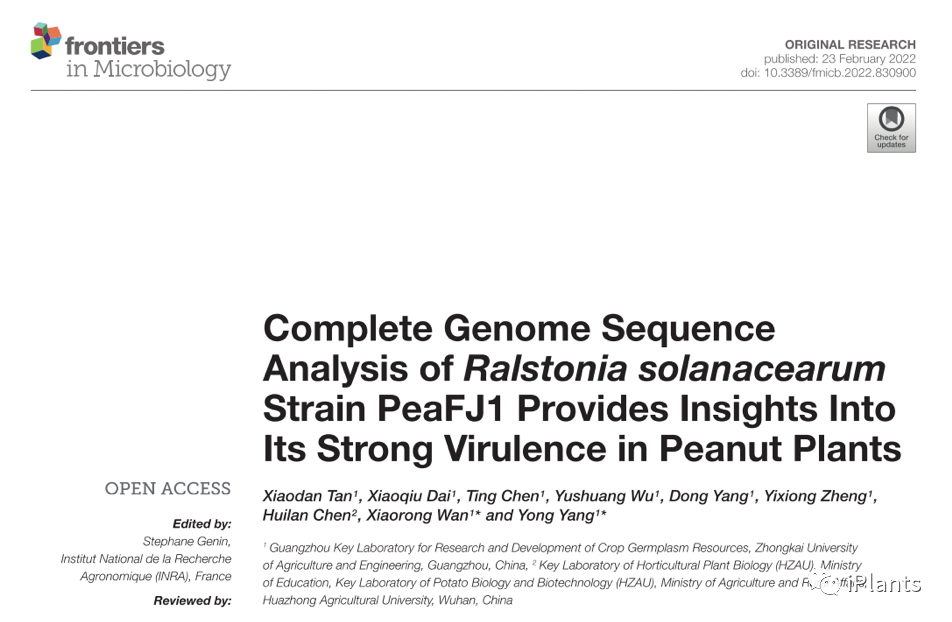 2022年2月,伟德bv1946官网、广州市特色作物种质资源研究与利用重点实验室分别在JCR 1区期刊Frontiers in Microbiology和Frontiers in Plant Science发表了题为Complete Genome Sequence Analysis of Ralstonia solanacearum Strain PeaFJ1 Provides Insights into its Strong Virulence in Peanut Plants和Transcriptome Analysis Revealed the Mechanisms Involved in Ultrasonic Seed Treatment-Induced Aluminum Tolerance in Peanut的两篇研究论文。