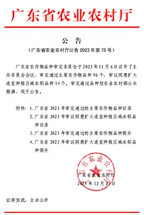 2023年12月27日,广东省农业农村厅发布关于广东省农作物品种审定结果的公告(广东省农业农村厅公告 2023 年第 75 号),公司伟德bv1946官网、广州市特色作物种质资源研究与利用重点实验室、广东省玉米产业技术创新团队选育的糯玉米“仲糯6号”和甜玉米“仲甜10号”、“仲甜11号”分别通过广东省农作物品种审定委员会审定会议,审定编号分别为:粤审玉20230002,粤审玉20230010和粤审玉20230016,审定通过品种经农业农村部公示期满,现予公告。