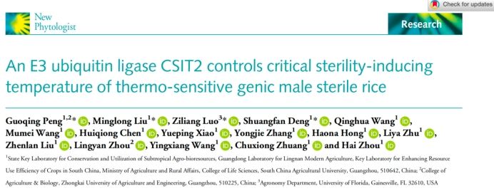 近日,公司青年学者彭国清在植物学知名期刊New Phytologist (IF=10.8)上发表了题为“An E3 ubiquitin ligase CSIT2 controls critical sterility-inducing temperature of thermo-sensitive genic male sterile rice”的研究论文(https://nph.onlinelibrary.wiley.com/doi/10.1111/nph.19520)。这是距离去年2023年10月在Molecular Plant (IF=27.5)上发表了题“The E3 ubiquitin ligase CSIT1 regulates critical sterility-inducing temperature by ribosome-associated quality control to safeguard two-line hybrid breeding in rice”的论文之后,再次克隆了调控水稻温敏雄性不育的不育起点温度新基因,进一步解释了通过蛋白质质量控制过程调控水稻温敏雄性不育的育性转变温度的分子机制。