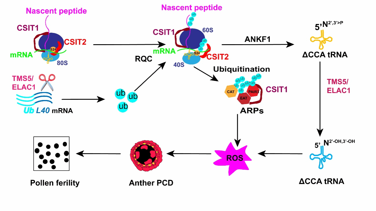 公司仲恺青年学者彭国清克隆了两个水稻温敏不育系的不育起点温度的基因CSIT1CSIT2,这些基因突变会导致不育起点温度上升,杂交制种时不育系容易自交结实而导致制种失败(即两系制种不安全性)。CSIT1CSIT2均编码E3泛素连接酶,与TMS5一起参与核糖体关联的蛋白质质量控制。CSIT1主要参与翻译错误蛋白或未正确折叠多肽的泛素化,而CSIT2在蛋白质翻译出错时泛素化核糖体蛋白使核糖体大小亚基解离。而核糖体解离后,参与翻译的tRNA也从核糖体解离下来,此时的tRNA的3'端存在缺陷,可能需要TMS5切去缺陷的3'端,重新加上CCA成为有活性的tRNA。
