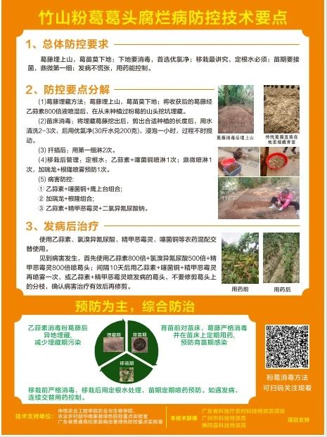 针对春季葛藤管理关键期,喻国辉教授深入讲解消毒技术原理与操作规范。“葛藤切口是病原菌入侵的主要途径,科学的消毒能降低80%以上病害发生率。”培训聚焦实践痛点,分阶段演示了萌芽期、生长期及采收前的药剂配比、器械使用及环境管控要点。为确保技术精准落地,团队特别设计“一图读懂”操作流程图,并发放内含视频教学二维码的《粉葛绿色防控手册》,农户可通过手机随时回看关键技术节点。