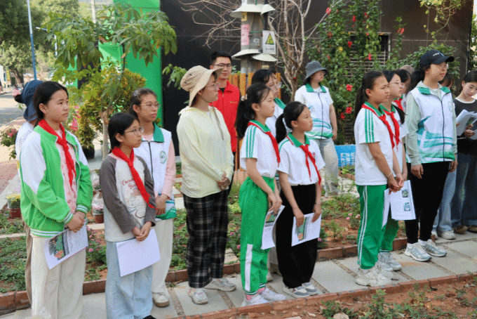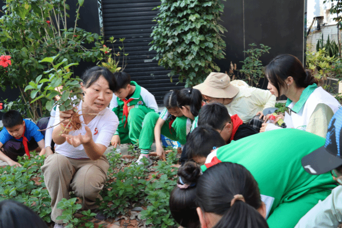 在天河区凤凰街渔兴社区新时代文明实践工作站旁的口袋公园内,两位教师以客家特色植物为切入点,通过“闻香识草”“触叶辨形”等互动环节,生动讲解菇稔子、薄荷、艾草及姜花的药用价值、生态功能与文化内涵。理论讲解结束后,老师们带领孩子们亲手种植薄荷,让孩子们在实践中感受植物的魅力,极大地激发了孩子们对植物世界的浓厚兴趣。
