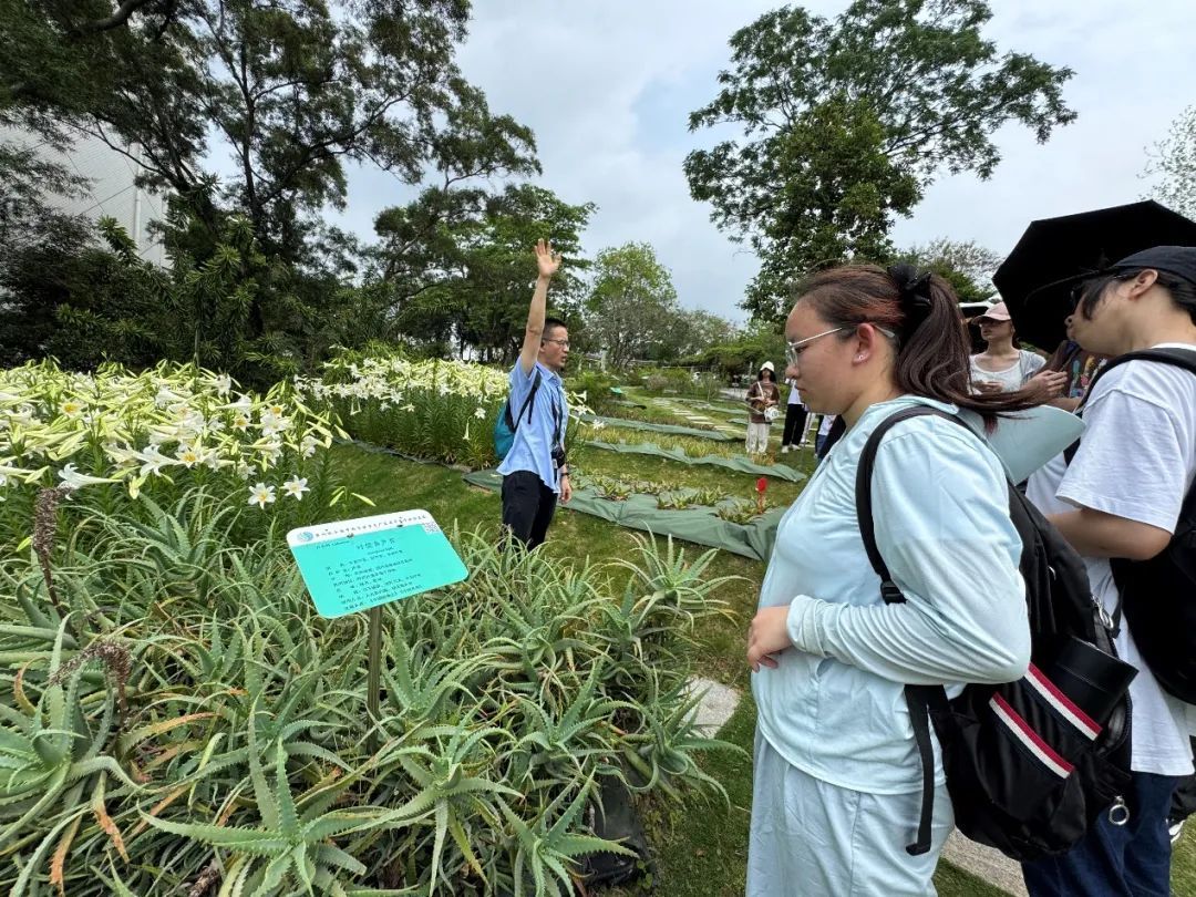 当日上午,员工们首先深入广州中医药大学时珍山和药王山,在该校童家赟老师的指导下开展药用植物鉴定实践。植物园内,1500余种药用植物依科属分类种植,形成活态标本库。员工们在童老师的指导下,对照植物挂牌上的拉丁学名、科属、药用部位等信息,逐一辨识蕨类海金沙、豆科的广金钱、廖科的虎杖、忍冬科的金银花、唇形科的广藿香和藿香等典型药用植物。通过触摸、解剖叶片与花结构,重点学习了叶脉类型(如禾本科植物的平行叶脉)、复叶形态(如莺哥木的掌状复叶)等鉴别要点,并记录了不同植物的生态习性。实践环节中,师生还围绕 “药用植物的采收时间以及不同入药部位对功效的影响” 展开讨论。例如,忍冬科植物金银花的采收时间决定了其药效成分绿原酸的含量,因而非常关键;此外,桑科植物桑的干燥枝、干燥根皮、叶子、果穗均可入药,分别称为桑枝、桑白皮、桑叶、桑椹,不同部位呈现不同的功效,桑枝性平,用于祛风通络、利水消肿;桑白皮性寒,用于泻肺平喘;桑叶性寒,味甘、苦,常用于疏风散热、清肺润燥;桑葚性寒用于滋阴补血,生津润燥。