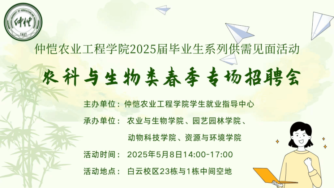 为满足广东省农业行业对人才的需求,促进2025届农学类、生物类等毕业生的顺利就业,并给广大用人单位搭建好人才输送平台、满足各企事业单位人才结构调整和人才战略储备的需求,积极促进公司2025届毕业生顺利实现高质量就业,由伟德bv1946官网员工就业指导中心主办,伟德bv1946官网、园艺园林公司、动物科技公司、资源与环境公司共同承办,定于2025年5月8日14:00-17:00举办伟德bv1946官网农科与生物类2025届毕业生春季专场招聘会。