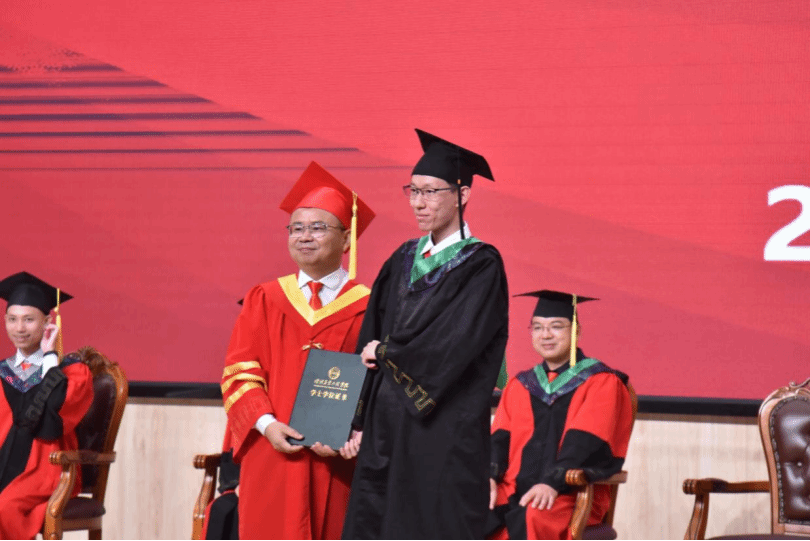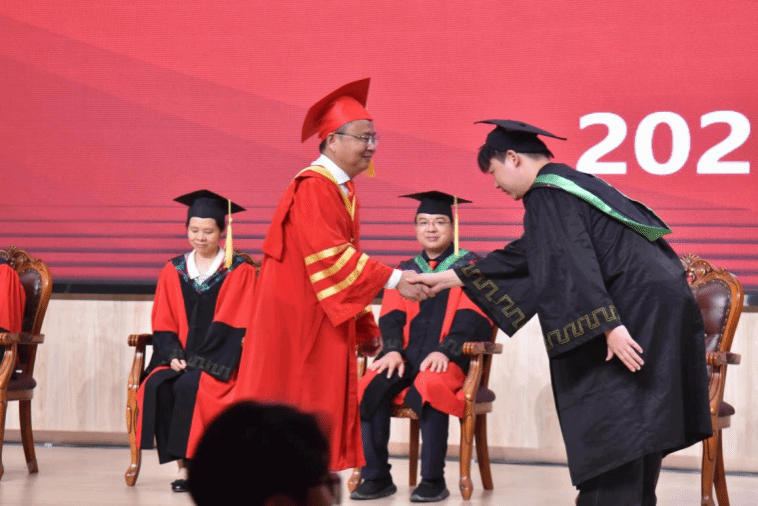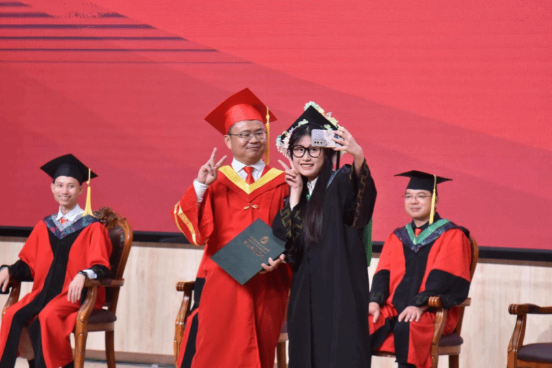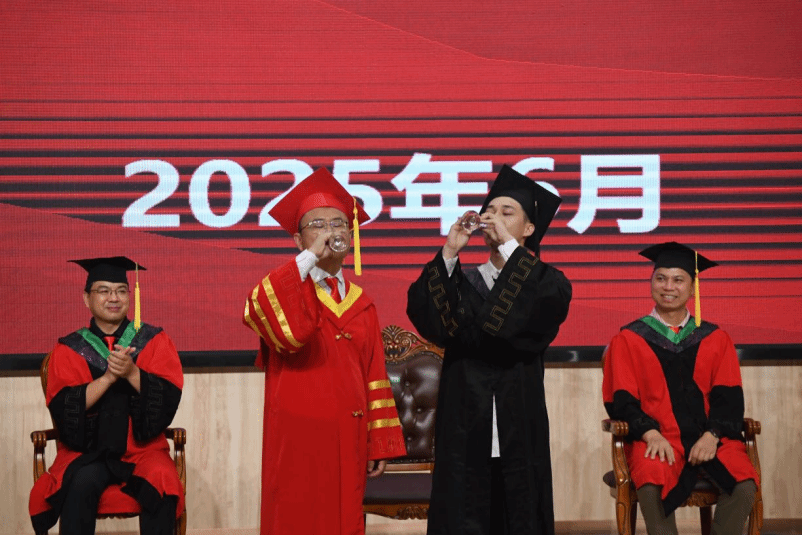 致辞完毕,喻国辉经理为每一位同学拨穗正冠。当流苏从右至左轻拂,是知识沉淀的见证,更是责任与使命的交接。导师们与毕业生握手、合影,目光里满是欣慰与祝福,这一个个瞬间,定格成青春最珍贵的剪影。