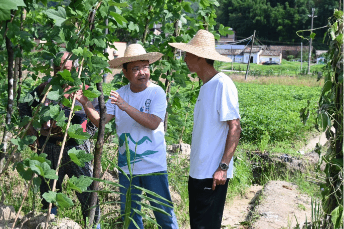抵达基地后,喻国辉教授和孙昀皓副教授立即深入竹山粉葛种植区,细致观察粉葛的生长细节,从藤蔓的蓬勃伸展到叶片的鲜亮色泽,再到块根的茁壮发育,他们对粉葛的生长态势进行了全面而深入的评估。随后,他们与周边农户亲切交谈,深入了解竹山粉葛的种植现状、面临的问题以及农户的实际需求。