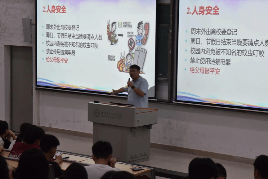 随后,李城着重强调了安全教育相关内容。在防范诈骗方面,他提醒大家不轻信陌生来电、短信、链接,不随意透露身份证号、银行卡号、验证码,警惕“刷单返利”“冒充客服”“冒充熟人借钱”等常见骗局。人身安全上,要遵守交通规则,不酒后骑行,外出告知室友或朋友行程,夜间尽量结伴而行。网络安全方面,不浏览不良网站,不传播不实信息,保护好账号密码,谨慎添加陌生好友,不随意泄露个人隐私。政治安全上,要坚定政治立场,维护国家统一和民族团结,不参与非法组织和活动,文明上网、理性发言。
