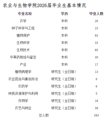 设有农学(含生物育种科学创新班)、种子科学与工程(含生物育种科学创新班、仲华基因科技产业创新班)、植物保护、生物技术(含生物育种科学创新班、仲华基因科技产业创新班)、生物科学(含生物科学类中新国际班)等6个本科专业。