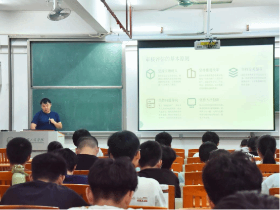 接着,李城聚焦公司本科公司产品审核评估工作,以“我为评估做贡献”学风建设为主题开展“迎评应知应会”专题宣讲。他以《本科公司产品审核评估知识手册(员工版)》为核心依据,着重阐述评估与同学们的学习生活紧密关联,呼吁大家熟知校史校情、热词释义、审核评估要义、恪守校纪校规,以“主人翁”身份展现良好精神状态,主动参与评建活动,全力配合评估的各项工作要求。