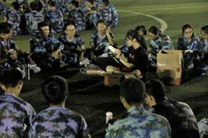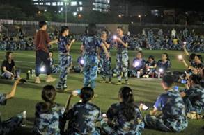 中秋佳节,是合家团圆的节日。我们的助班都没有回家,陪着我们一起过中秋,我们心里特别感动。当晚,公司在操场为我们组织一场以班级为单位的中晚聚会。我们和助班围坐成一圈,一起吃着助班们为我们准备的月饼。同时,在响彻悦耳歌声的足球场上一起做游戏,一起开心地畅谈军训的感受与收获。