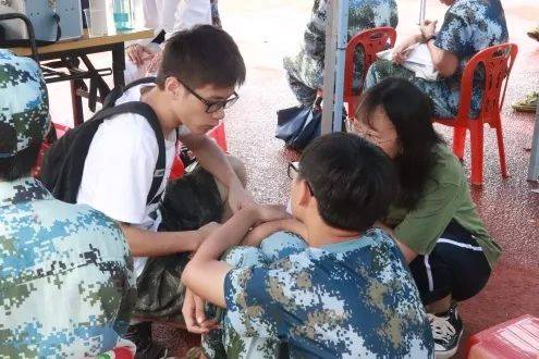 每天,辅导员苏登老师都会来到操场关心我们的军训进度,以及了解大本营同学的身体状况。他会每天安排好工作人员及时整理和清点药品数量,保证大本营的药品供应。同时他也会主动向教官们详细地询问军训时我们的身体状况,并要求教官军训纪律严明、科学施训。