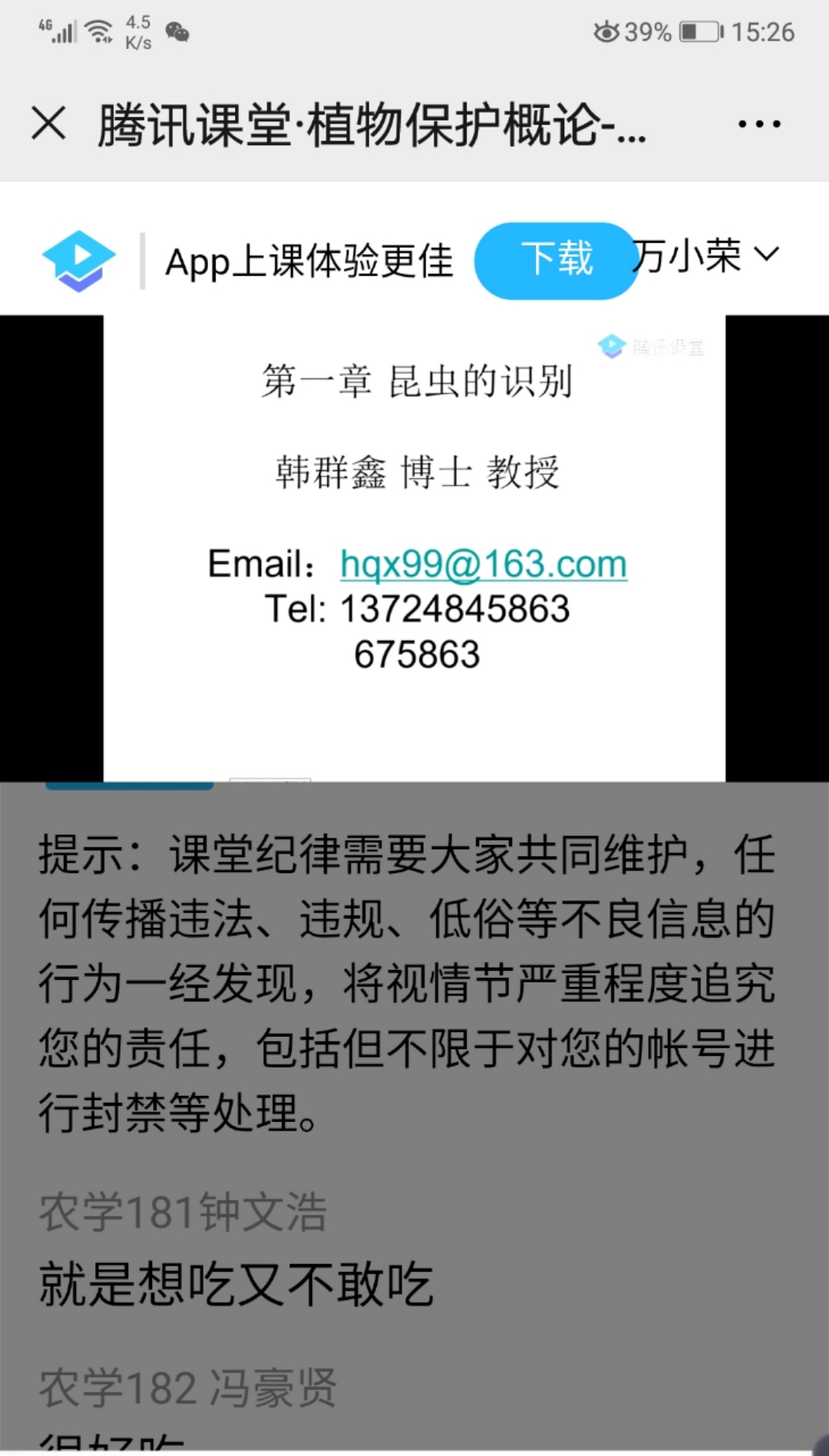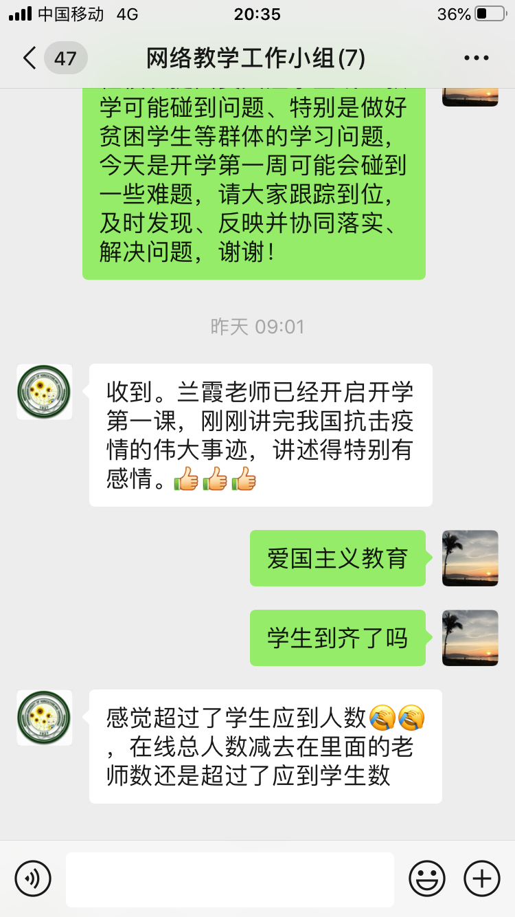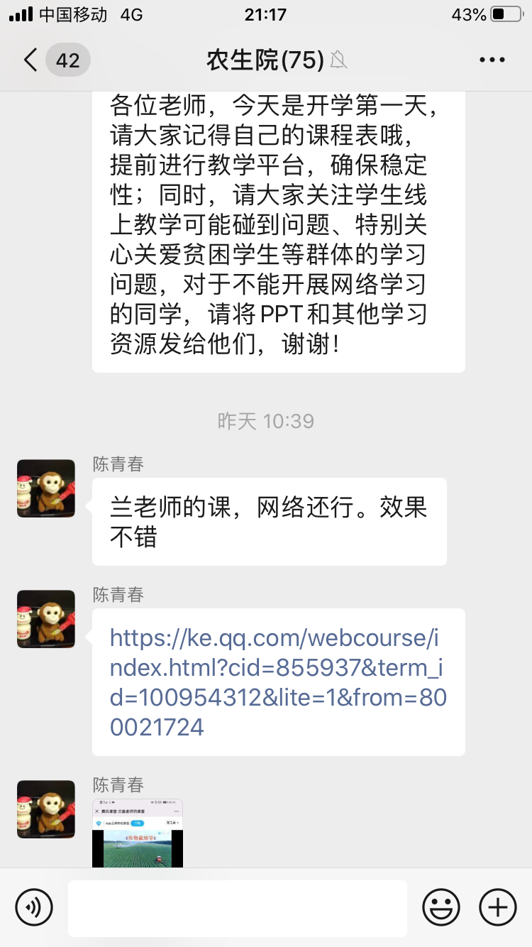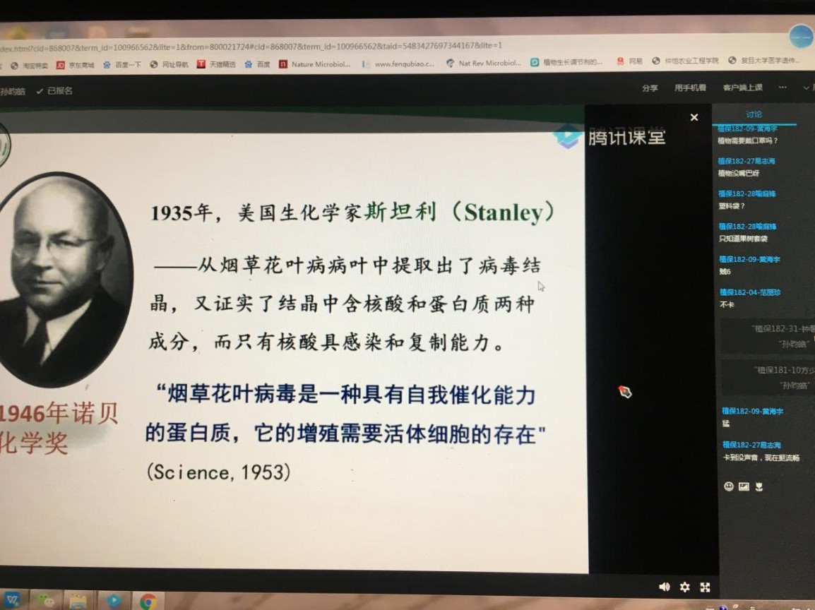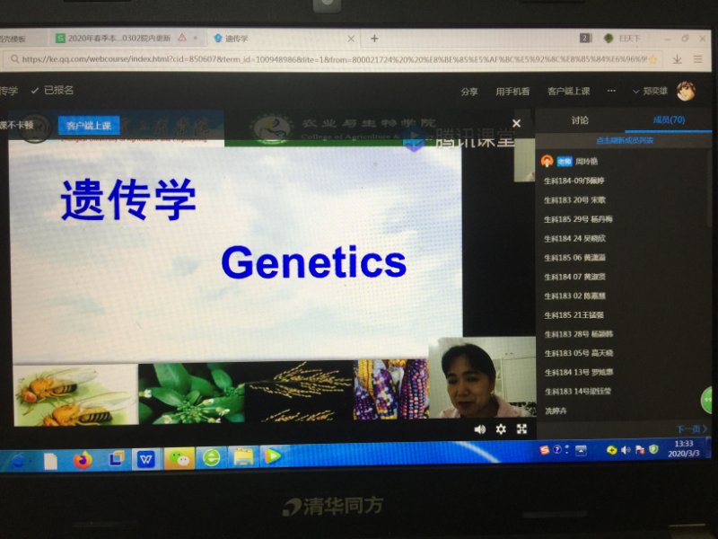 伟德bv1946官网本学期共承担66门理论课教授,必修课33门,专业选修课25门,公选课8门。其中,开学第1天、第2天开课总共23门。使用的网络平台主要有超星学习通、腾讯课堂、雨课堂等。公司领导及本科应急教学工作小组主要听取了孙昀浩老师的《植物免疫学》、杨彬老师的《作物遗传学》、崔华威老师的《种子经营管理学》、李春梅老师的《农业生态学》和《基因组学概论》、孙晓芳老师的《创新创业教育基础》、周玲艳老师的《遗传学》、兰霞老师的《作物栽培学》、韩群鑫老师的《植物保护概论》等课程。周玲艳老师的《遗传学》和杨彬老师的《作物遗传学》以腾讯直播为主,结合超星学习通进行课前预习、课后练习、讨论、阅读等。崔华威老师的《种子经营管理学》以雨课堂进行教学,其他老师采用腾讯课堂进行直播。老师们状态饱满、声音洪亮,提前进入课堂,课程PPT制作良好,结合爱国主义、课堂思政教育,网络基本流畅、语音播放清晰,员工积极参与互动。其中,孙晓芳老师虽然身在疫区,还是备课非常充分。但还是存在个别课程个别同学迟上线,上课过程中掉线现象,以及在上课中互动回答问题存在回音或者无法正常上台回答问题的现象。