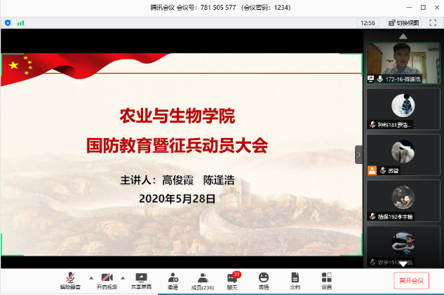 为鼓励更多同学响应国家号召,积极报名投身军旅,在军营中磨砺自我、提高自我,5月28号下午,伟德bv1946官网通过腾讯会议平台召开2020年国防教育暨征兵动员大会。辅导员高结怡、苏登以及17级退伍员工陈逢浩、16级退伍员工高俊霞参加了本次会议。会议由苏登老师主持。