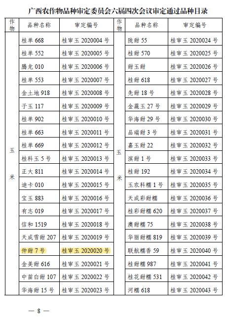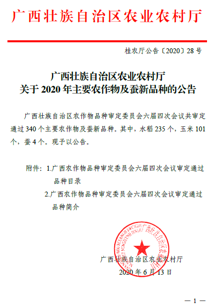 6月13日,广西壮族自治区农业农村厅发布关于2020 年主要农作物新品种公告(桂农厅公告〔2020〕28 号),公司伟德bv1946官网、岭南特色作物遗传育种校级科技创新团队、广州市特色作物种质资源研究与利用重点实验室、广东省鲜食玉米产业技术创新团队选育的甜玉米新品种“仲甜7号”通过广西壮族自治区农作物品种审定委员会六届四次会议审定,审定编号:桂审玉2020020号,予以公告。该品种由公司刘鹏飞博士主持选育,经广西壮族自治区品种区域试验及新品种审定委员会审核,该品种符合广西鲜食玉米审定标准,通过审定,可在广西全区种植。这是公司鲜食玉米育种的又一重要科研成果。