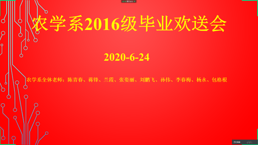 2020年6月24日下午,伟德bv1946官网农学系在腾讯会议平台举行了2016级农学专业毕业欢送会。公司党总支书记陈丹雄、经理郑奕雄、党总支副书记周超雄、副经理周玲艳、农学系全体老师、辅导员孙晓芳老师应邀出席,并为毕业生送上了美好祝愿。欢送会由农学系主任、农学16班主任陈青春副教授主持。