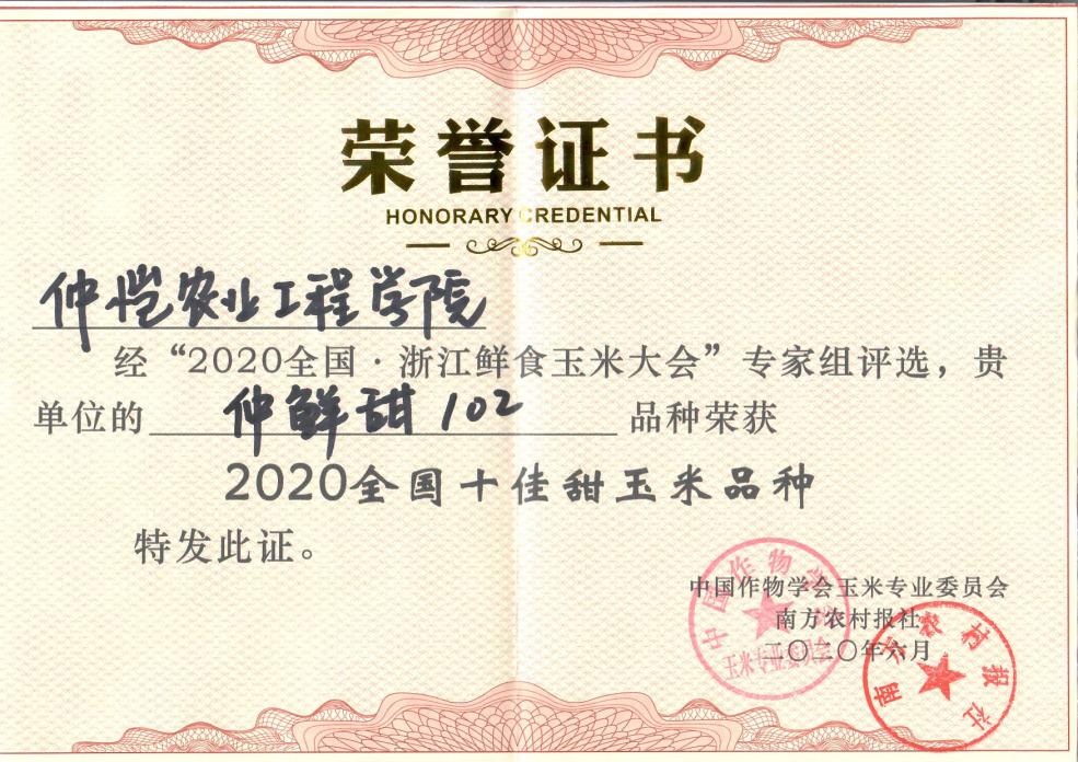 此次品种评选,通过前后两批次、初选和复选两个环节的仔细鉴评,40个品种最终进入展示品种排行榜。公司”仲鲜甜102”初选和复选均排名第3,被评为2020年全国十佳甜玉米品种。公司刘鹏飞博士也参与此次评选复选环节。通过参加此次全国鲜食玉米会议,对公司的鲜食玉米育种水平和成果起到了很好的展示和示范作用。