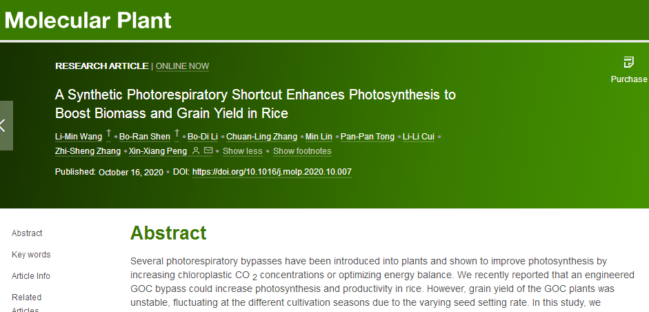 2020年10月16日,伟德bv1946官网教师王丽敏博士在Molecular Plant(IF2019=12.084)上发表题为“A Synthetic Photorespiratory Shortcut Enhances Photosynthesis to Boost Biomass and Grain Yield in Rice”的研究论文(https://www.cell.com/molecular-plant/fulltext/S1674-2052(20)30353-1)。该研究利用优化后的叶绿体信号肽(RC2)将水稻乙醇酸氧化酶(OsGLO1)、大肠杆菌过氧化氢酶(EcCAT)、乙醛酸聚醛酶(EcGCL)和羟基丙二酸半醛还原酶(EcTSR)四个酶导入水稻并定位到叶绿体中,使光呼吸产生的部分乙醇酸直接在叶绿体内代谢释放CO2,形成了类似C4植物的CO2浓缩机制。该途径的碳计量与植物光呼吸途径完全一致,因此亦可称为光呼吸捷径(以下简称GCGT捷径)。此捷径的引入显著提高了水稻的光合效率、生物量和产量。