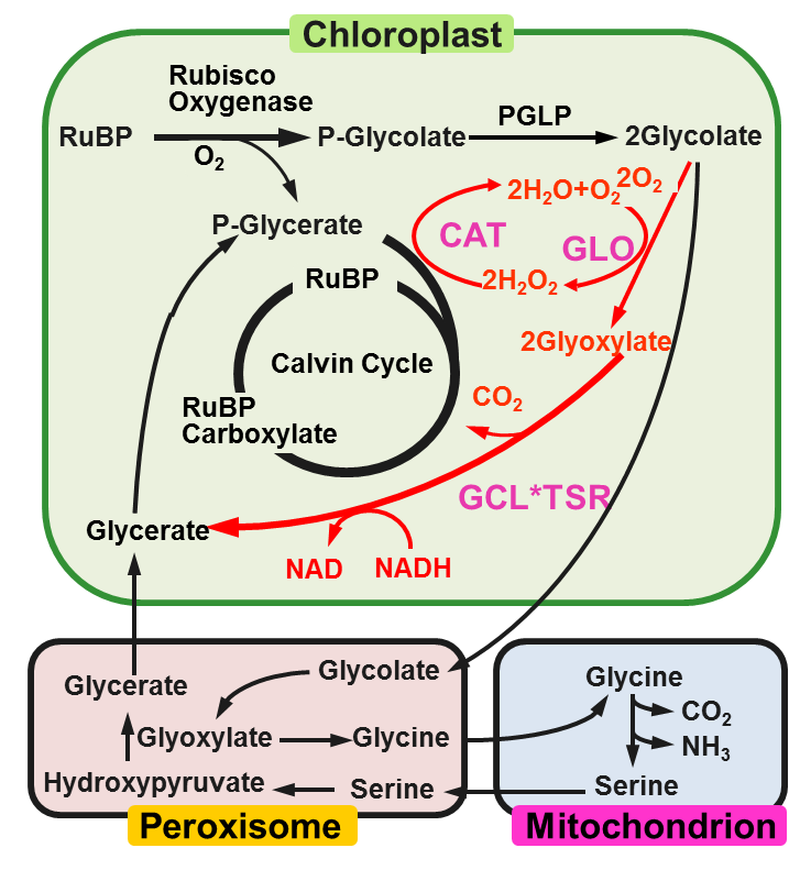 光呼吸是植物绿色组织利用光能,吸收O2并释放CO2的过程,需要叶绿体、线粒体、过氧化物酶体和细胞质的共同参与,是C3植物中仅次于光合作用的第二大代谢流。 正常环境条件下,C3植物的光呼吸可消耗掉光合产物的25-30%,在逆境条件下(高温、高光、干旱等)这种损耗会更加严重。通过降低光呼吸速率来提高植物的光合效率具有很大的潜能。GCGT捷径的总反应是将2分子的乙醇酸转变成1分子的甘油酸和1分子的CO2,与内源光呼吸途径一样回收了3/4的碳(图1)。