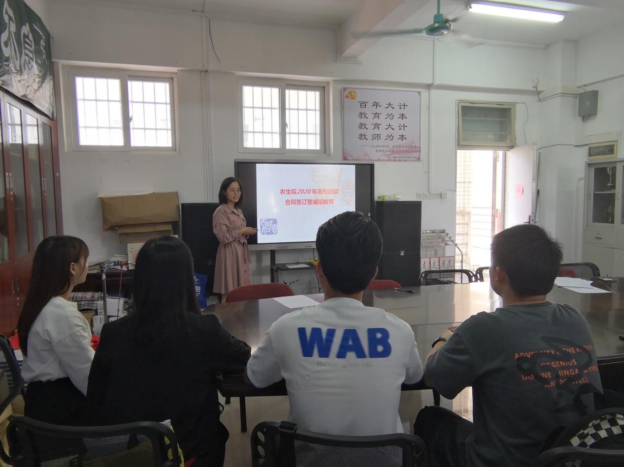 为进一步推动国家助学贷款工作持续健康发展,积极构建“诚信贷款,资助育人”的校园文化氛围,提高资助育人实效,11月6日中午,伟德bv1946官网在白云校区刘宇新楼425举行2020年国家助学贷款合同签订暨诚信教育活动。公司辅导员孙晓芳出席并主持本次活动。