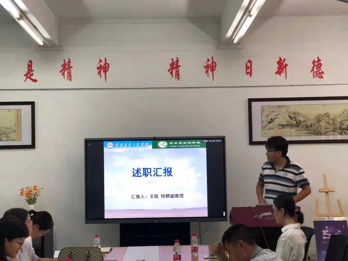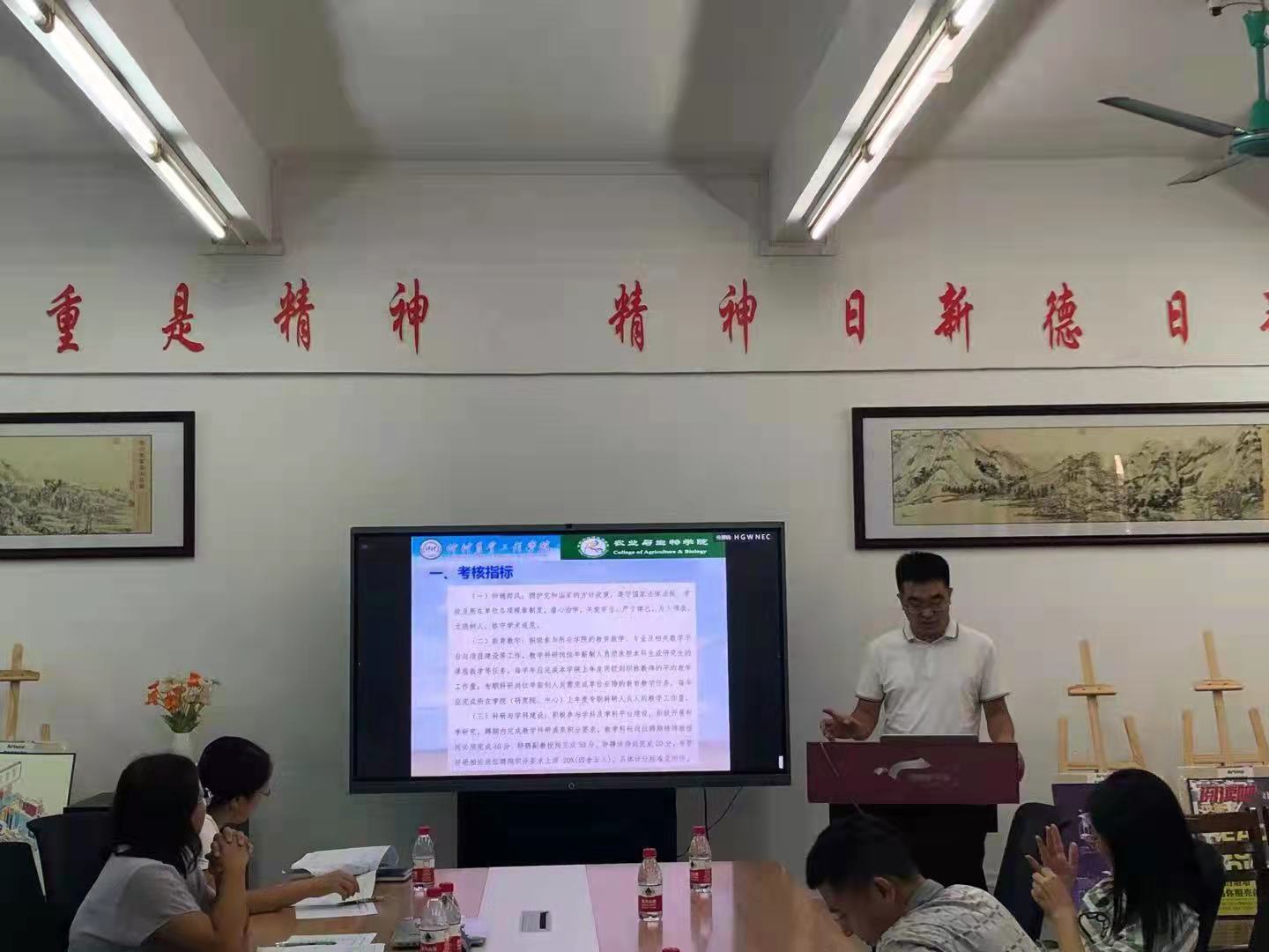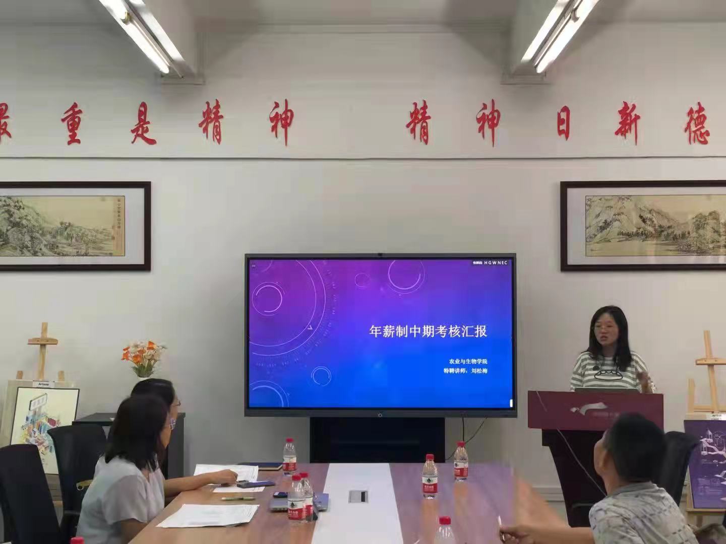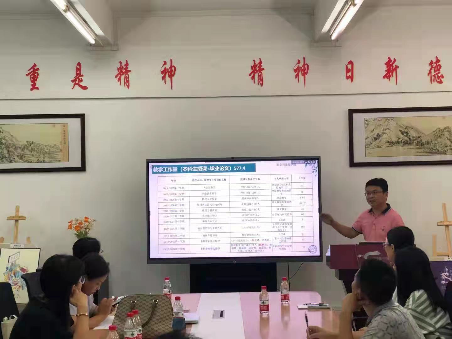 随后,13名年薪制人员和优秀博士一一采用PPT做时长8分钟的任期述职报告,对照聘期合同任务,汇报了个人在师德师风、教学业绩、科研业绩、人才培养与社会服务等方面任务完成情况,考核专家认真听取汇报,并对述职者逐一进行材料审阅、疑问质询和综合点评。汇报结束后,考评组成员经过认真研讨,对接受考评的专任教师形成公司考核意见。考评结果:聘期期满考核者均为聘期考核达标;期中考核者有4名考核优秀,但也有个别受考核教师明显未完成期中任务指标而依轻重分别受到工作提醒、重点预警。