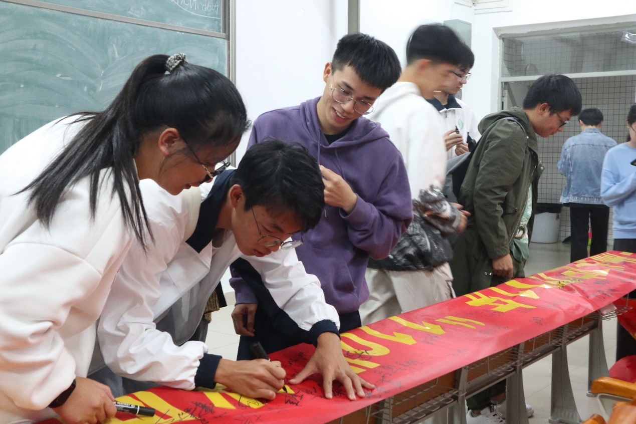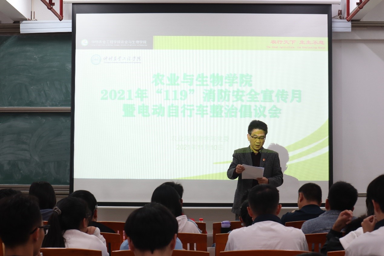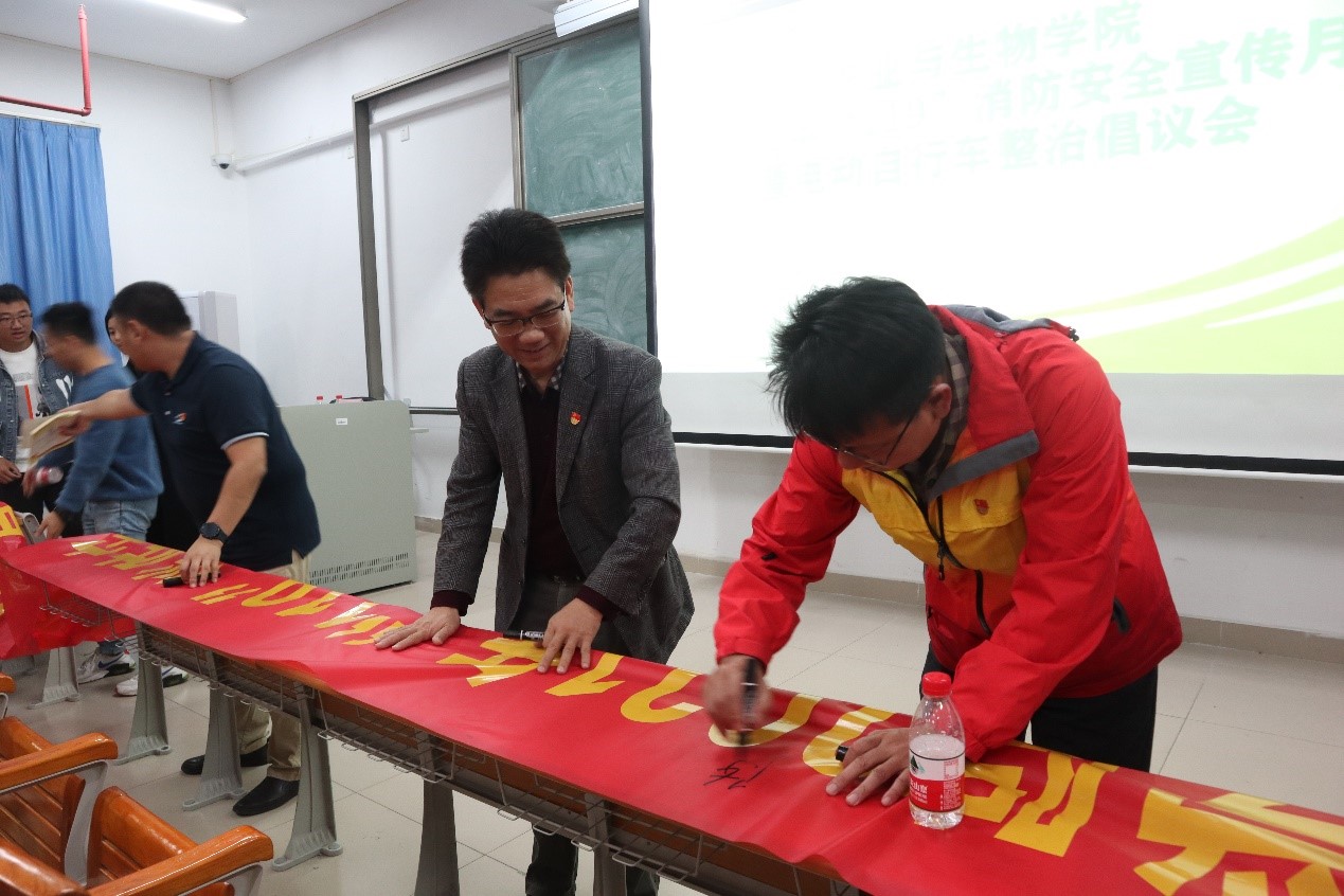 随后,陈丹雄进行讲话。他通过真实案例来着重强调了同学们一定要把安全放在最重要的地位,特别注意消防安全,生活中注意电动车自行车使用安全和宿舍电器的使用安全。他呼吁参会全体师生现场签名,要求会后各班紧急召开消防安全和电动自行车整治主题班会、每一位同学都要承诺签名,全院师生一起来做消防安全的宣传者,践行者和维护者,为共建安全、美好的校园而努力。
