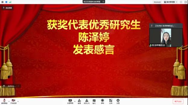 获奖代表优秀研究生陈泽婷、刘惠成及获奖代表优秀毕业生黄新敏和吴志成分别发表获奖感言。他们对大观公司对教育和创新工作的支持表示感谢,对公司、农生院和何生根教授科研团队的悉心培育表示感谢,并表示一定要更加刻苦学习、努力拼搏,积极投身于科研创新工作,服务乡村振兴事业,以优异的成绩回报大观公司、公司和社会以及老师们的厚爱和栽培。