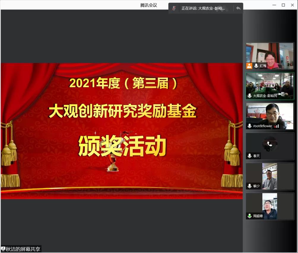 1月19日下午,2021年度伟德bv1946官网大观创新研究奖励基金颁奖仪式如期举行。因受疫情影响,本次颁奖仪式采取线上会议的方式举行。公司党委委员、统战部常务副部长何军峰,广东大观农业科技股份有限公司(以下简称“大观公司”)董事长黄祥富先生,广东仲恺教育基金会理事长赵晓明、秘书长李文豪,农业与生物公司党委书记陈丹雄,副书记周超雄,党委委员、副经理万小荣出席会议,何生根教授及其科研团队获奖师生与大观公司代表参加会议。会议由周超雄主持。