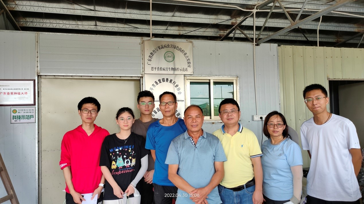 不误农时,助力春耕,趁着疫情得到有效控制和五一假期,伟德bv1946官网植物健康创新研究院执行副经理喻国辉教授及其团队成员一行于2022年4月30日到恩平市开展苹果粉和巴西蕉病害发生情况调查和春耕生产指导。恩平市圣堂镇及其周边的乡镇大规模栽培国家主推品种粉杂1号的时间较久,因长期连作,导致鞘腐病发生严重。植物健康创新研究院从2020年开始在圣堂镇的2家合作社和1家种植公司设定固定观测点,并在2021年将该地设为广东省普通高校果蔬病虫害绿色防控重点实验室的生物防控示范站。
