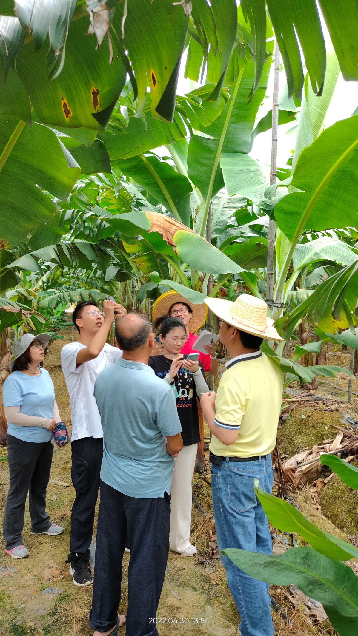 随后,一行人来到了晋昌水果公司调查粉杂1号和巴西蕉的鞘腐病发病情况。该公司的粉杂1号种植时间较长,连作导致病害基数高。团队首先进行了样品采集,然后对该地的鞘腐病开展了发病率统计。并和公司董事长老板梁六根先生一起对鞘腐病发病较轻的地进行发病植株的统计和标记,以便后续统计病情扩散情况和评估防控措施的效果,并为该蕉园的病害控制制定了几个治理方案。