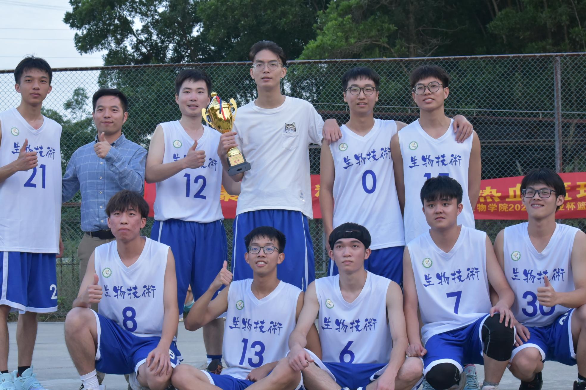随着裁判哨声的最后一次吹响,本次专业杯篮球赛决赛拉下了帷幕,生技和农学的比分为38:34,19级生技专业队凭借4分的优势获得本次比赛冠军,亚军为20级农学专业队,季军是20级植保专业队。比赛结束后,辅导员苏登为冠亚季军颁奖并合影留念。