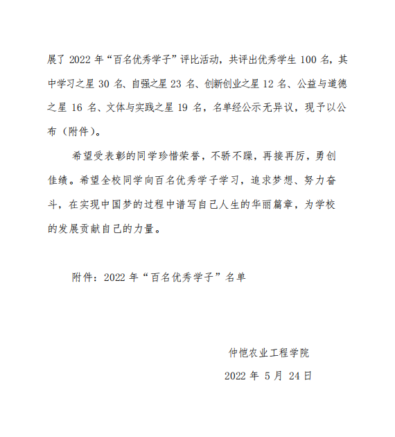 为表彰成绩、激励先进,根据《关于开展 2022 年“百名优秀学子”评比活动的通知》(仲学字〔2022〕16 号),公司开展了 2022 年“百名优秀学子”评比活动。